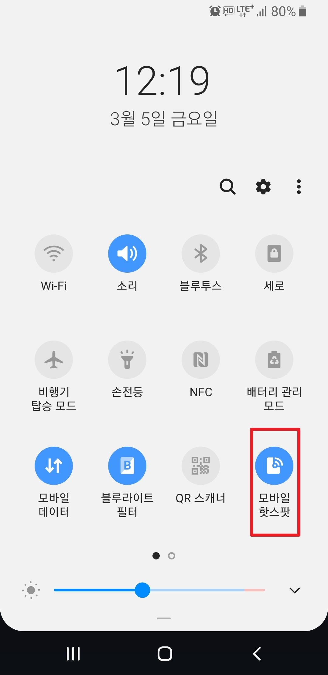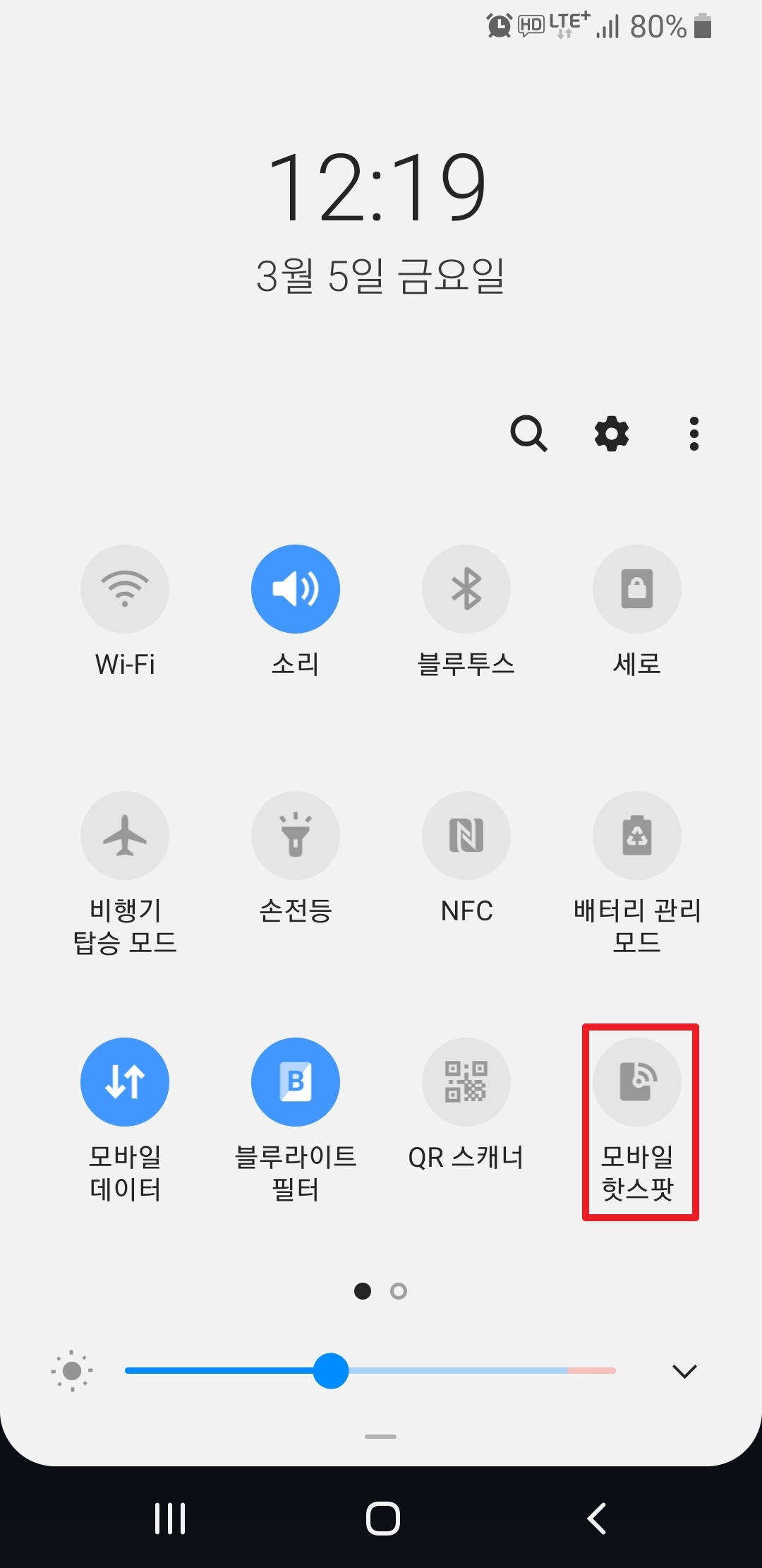 핸드폰 메인화면에서 화면은 손가락으로 아래로 쓸어내리면 빠른 메뉴가 위 화면같이 보이는데 그중"모바일 핫스팟"을 터치하여 활성화 시킨다. (휴대폰마다 화면구성이 다를 수 있으므로 위치는 다소 바뀔 수 있음)