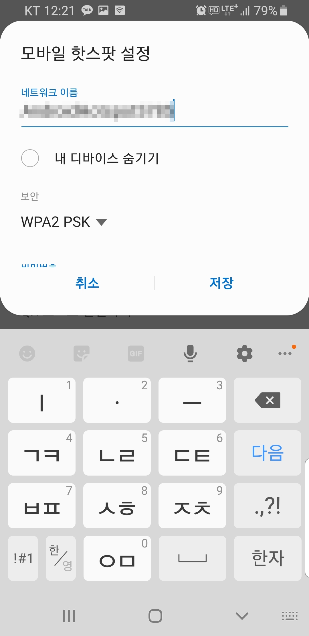 처음으로 모바일 핫스팟을 구동하다보면 설정화면으로 넘어가는데 설정에서 내 네트워크 이름을 확인 및 변경 할 수 있으며 비밀번호를 설정할 수가 있다.