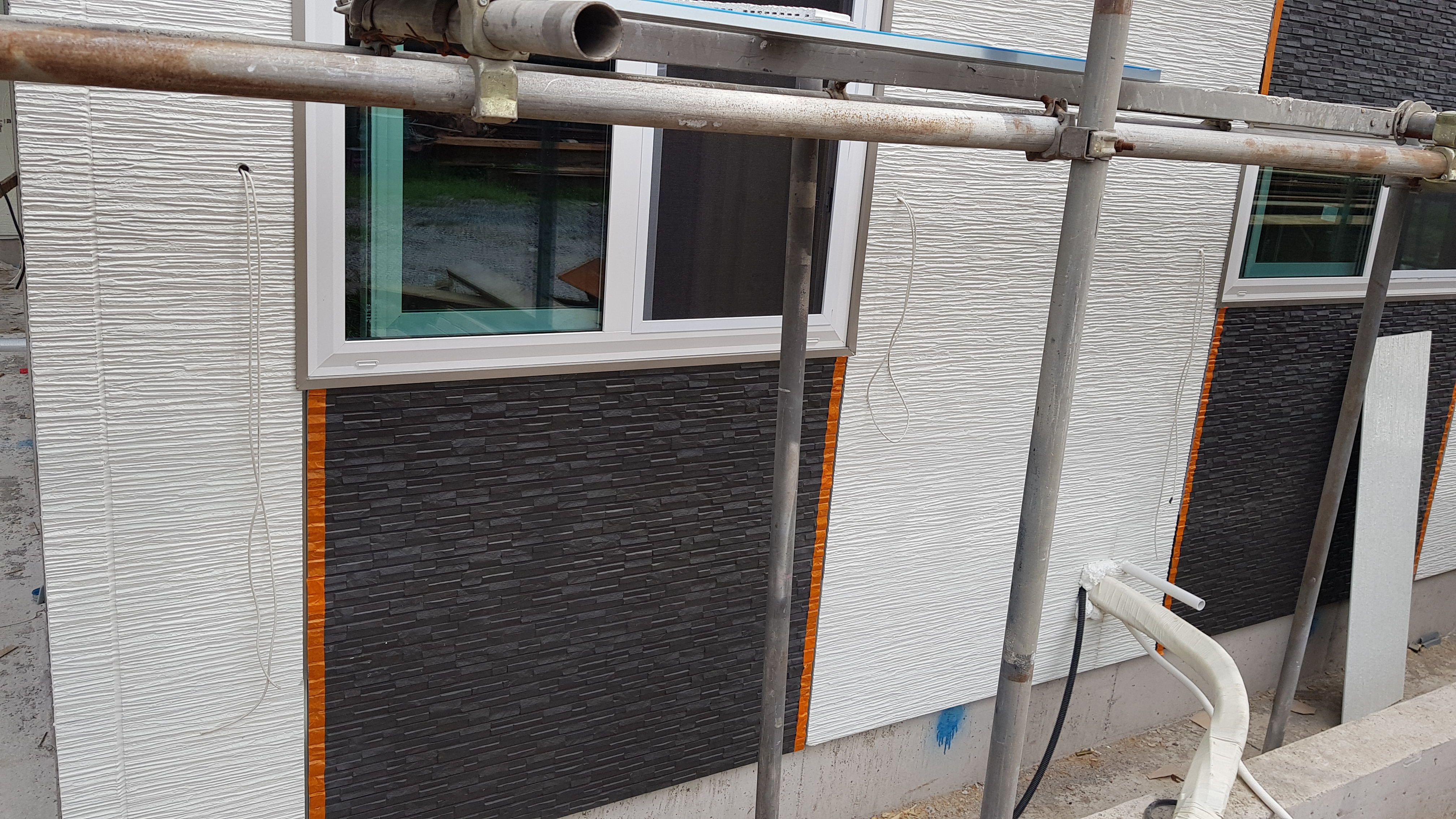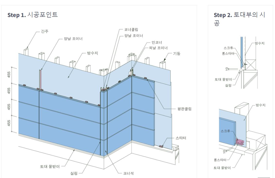스타코로 외벽마감을 하며 레인스크린을 따로 설치한다는건 다소 무리가고 외벽 포인트로 두었던 세라믹사이딩은 레인스크린을 둘 수가 있다고 한다. 자세한 설명을 들어보니 세라믹 사이딩은 클립방식으로 판재를 외벽에 거는 시공법을 사용하기 때문에 이 클립이 만들어주는 공간이 공기순환층이자 레인스크린 역할을 한다는 것이다.