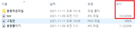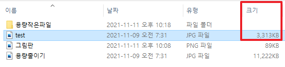 아이콘 보는 형식이 위처럼 '자세히보기' 형식으로 되어있으면 폴더에서 바로 용량을 볼 수가 있다. 사진 용량이 바로 보이지 않을때 확인하는 방법은 아래 사진의 방법을 따라하면 확인 할 수 있다.