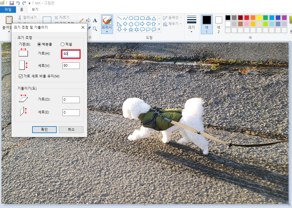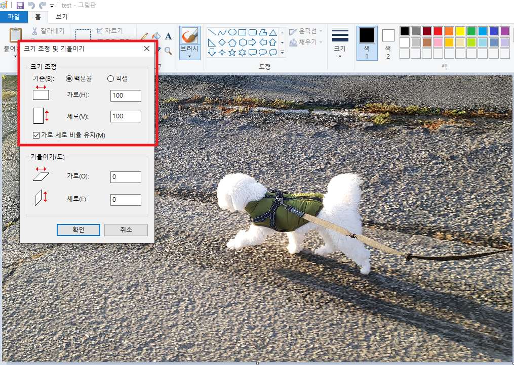 크기조정을 클릭해서 들어가면 '크기 조정 및 기울이기'라는 새로운 창이 뜬다. 우리는 크기와 용량을 줄일 것이므로 위에 빨간 박스해둔 곳에서 작업을 하면 된다. 백분율이 기본 100으로 되어있는데 이걸 줄이면 사진 크기와 용량을 줄일 수가 있다.