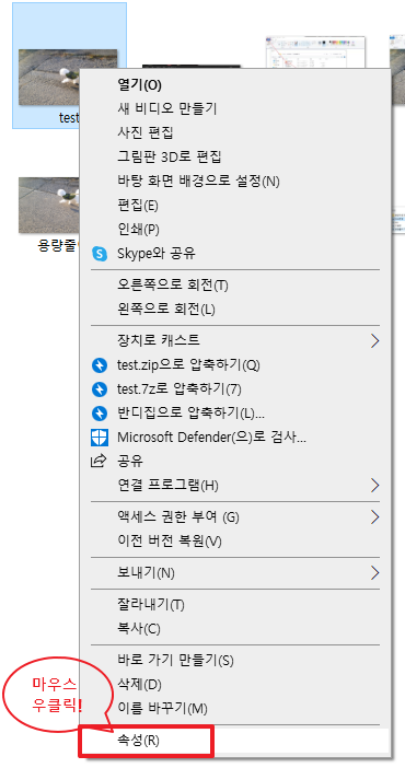 용량 확인할 사진파일을 '마우스 우클릭' - > 제일 아래 '속성' 클릭