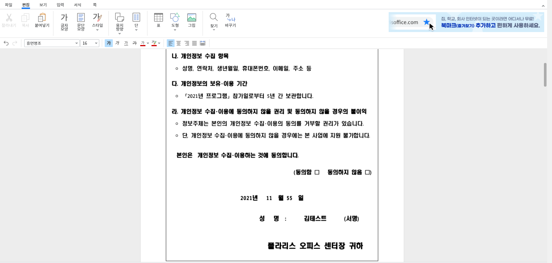 파일을 드래그해 보았다. 한글문서가 열리고 한글프로그램과 같은 화면으로 구성되어 있으며 여기서 바로 편집/수정을 할 수 있다.