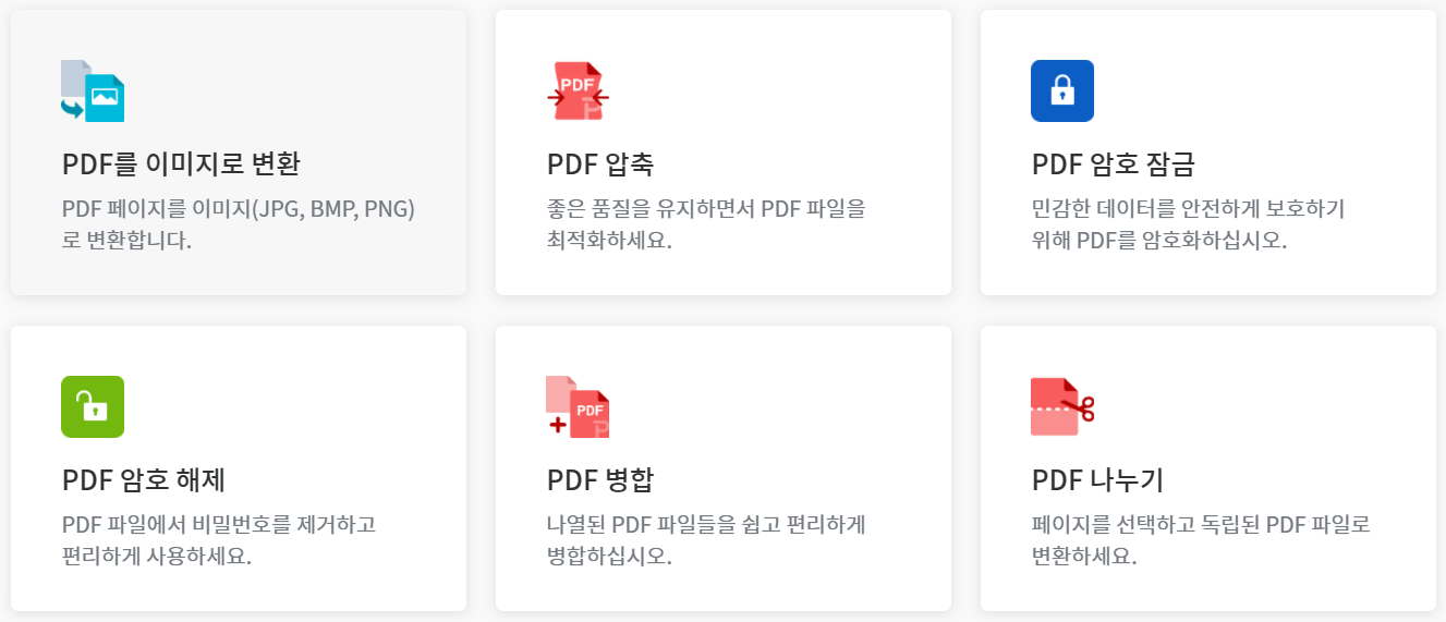 신규 기능으로 PDF를 이미지로 변환하기, PDF 압축, PDF 암호 잠금, PDF 암호 해제, PDF 병합, PDF 나누기 등의 기능이 있다.