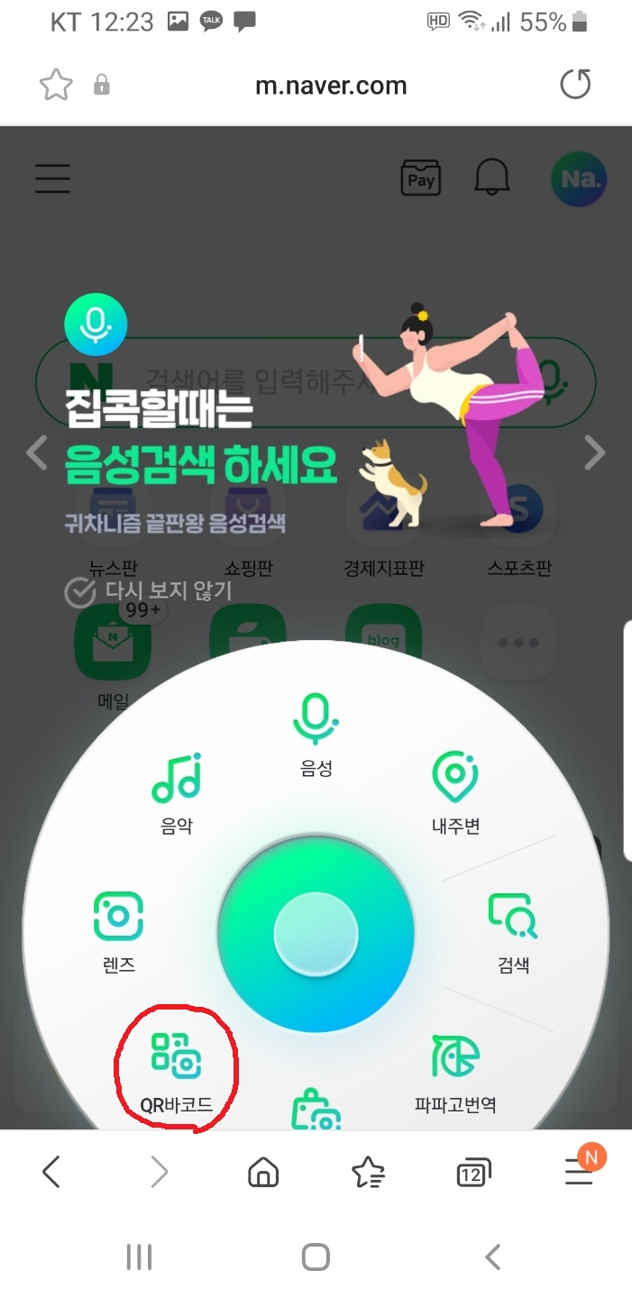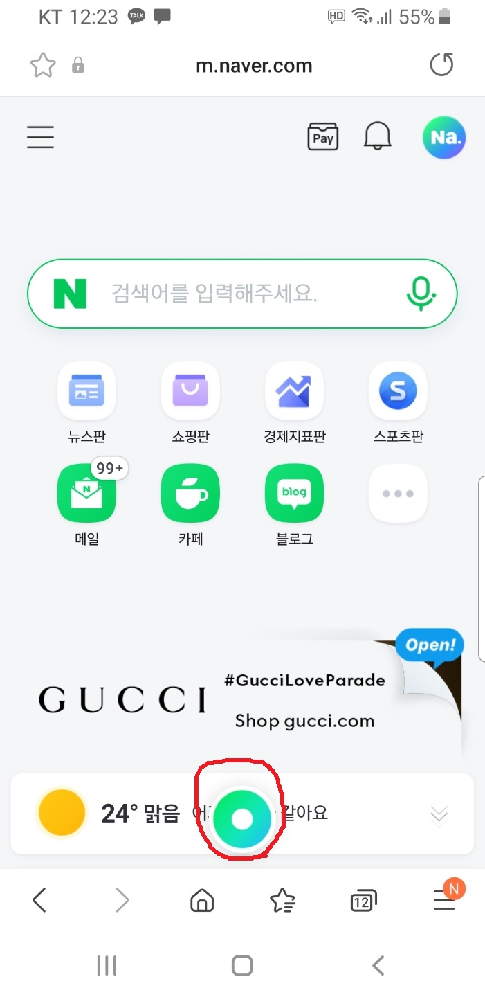 스마트폰에서 네이버에 들어가면 메인 화면 아래쪽에 사진에 표시해둔것과 같이 초록색의 동그라미가 보인다. 이를 클릭하자.