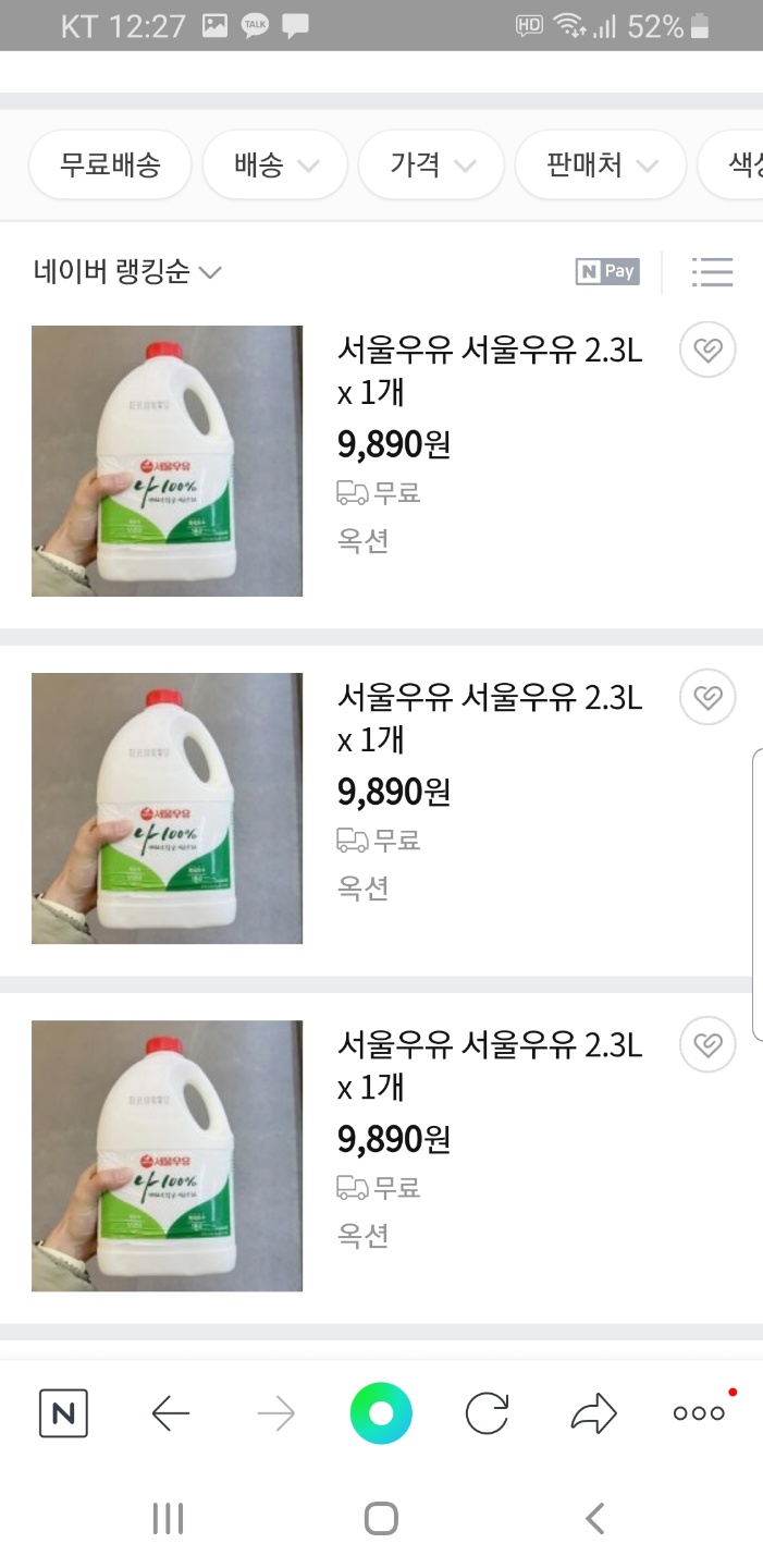 집에 있는 서울우유와 동일한 용량인 2.3L의 인터넷 판매요금이 검색되어 나온다. 마트에서 6,800원에 샀는데 인터넷 가격은 9,890원으로 더 비싸다. 인터넷에는 배송비가 붙어서 저 요금이 나오는것 같다.
