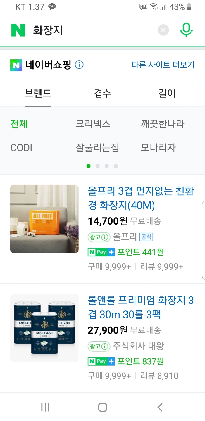 해당 물건이 네이버에서 검색되어 가격과 함께 나온다. 가장 낮은 가격이 상단에 올라와 있으며 스크롤을 내리면 여러 판매처서 판매되고 있는 가격을 볼 수 있다.