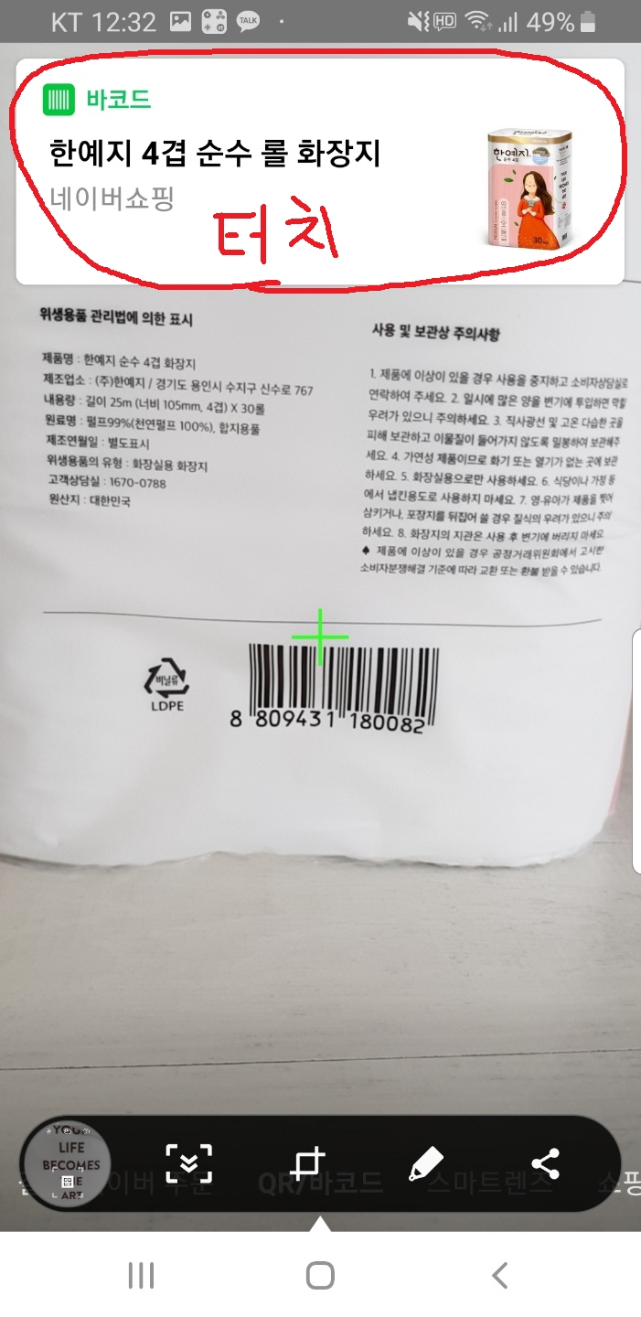 바코드가 인식되면 진동과 함께 화면 상단에 해당 물건이 나오는데 이를 터치하자.