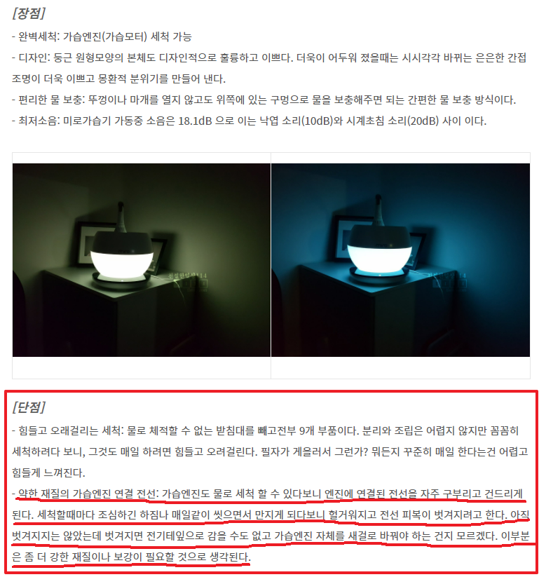 이전 포스팅했던 미로 가습기 구매 사용 후기에서 적었던 단점 2가지가 있었는데 그중 한가지로 약한 재질의 가습엔진 연결전선을 꼽아봤었다.