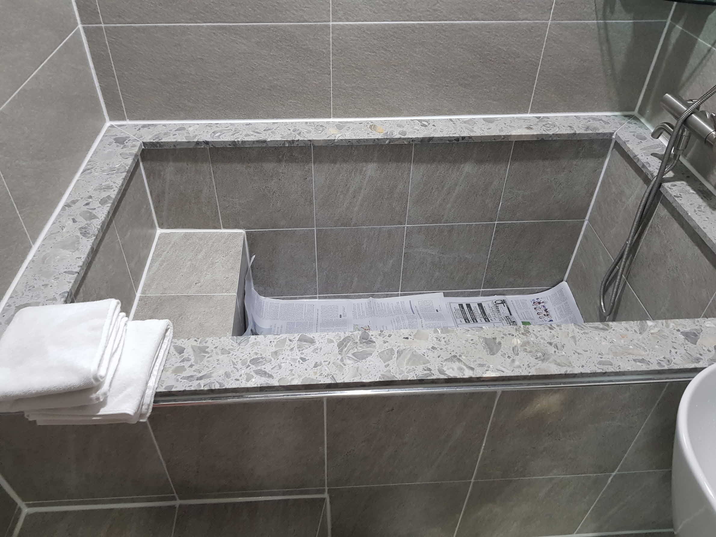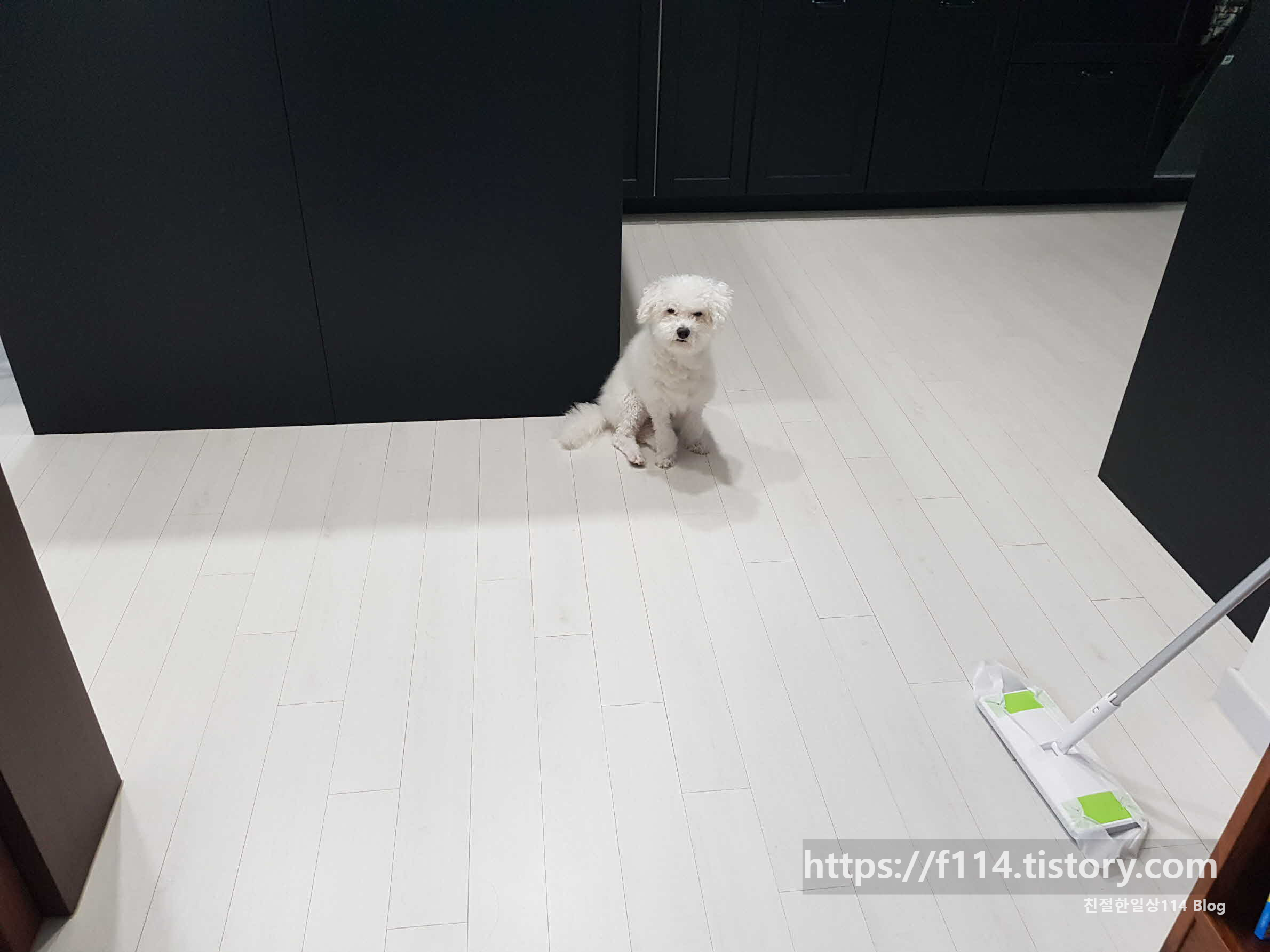 오늘의 손님이 입장했다. 평소 산책 후 발만 씻던것과 다른 분위기에 이상한걸 감지한듯 바닥을 살피고 있다.