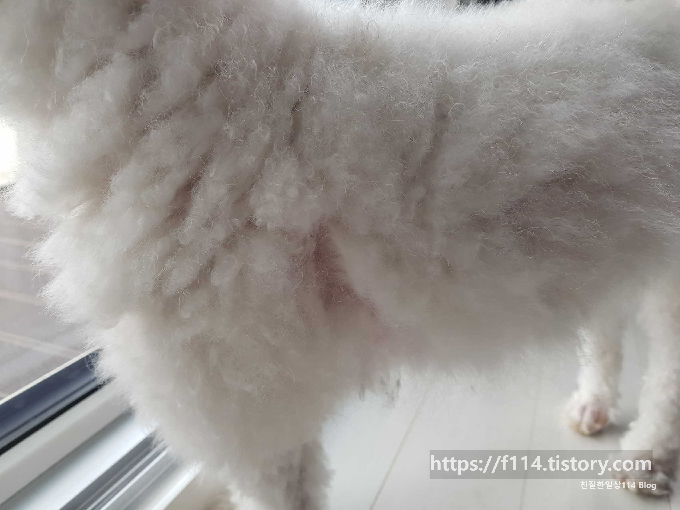 사실 털을 깍이며 작은 실수가 있었는데 옆구리 땜통과 엉덩이 쪽 고속도로를 만들어 버린 것이다.