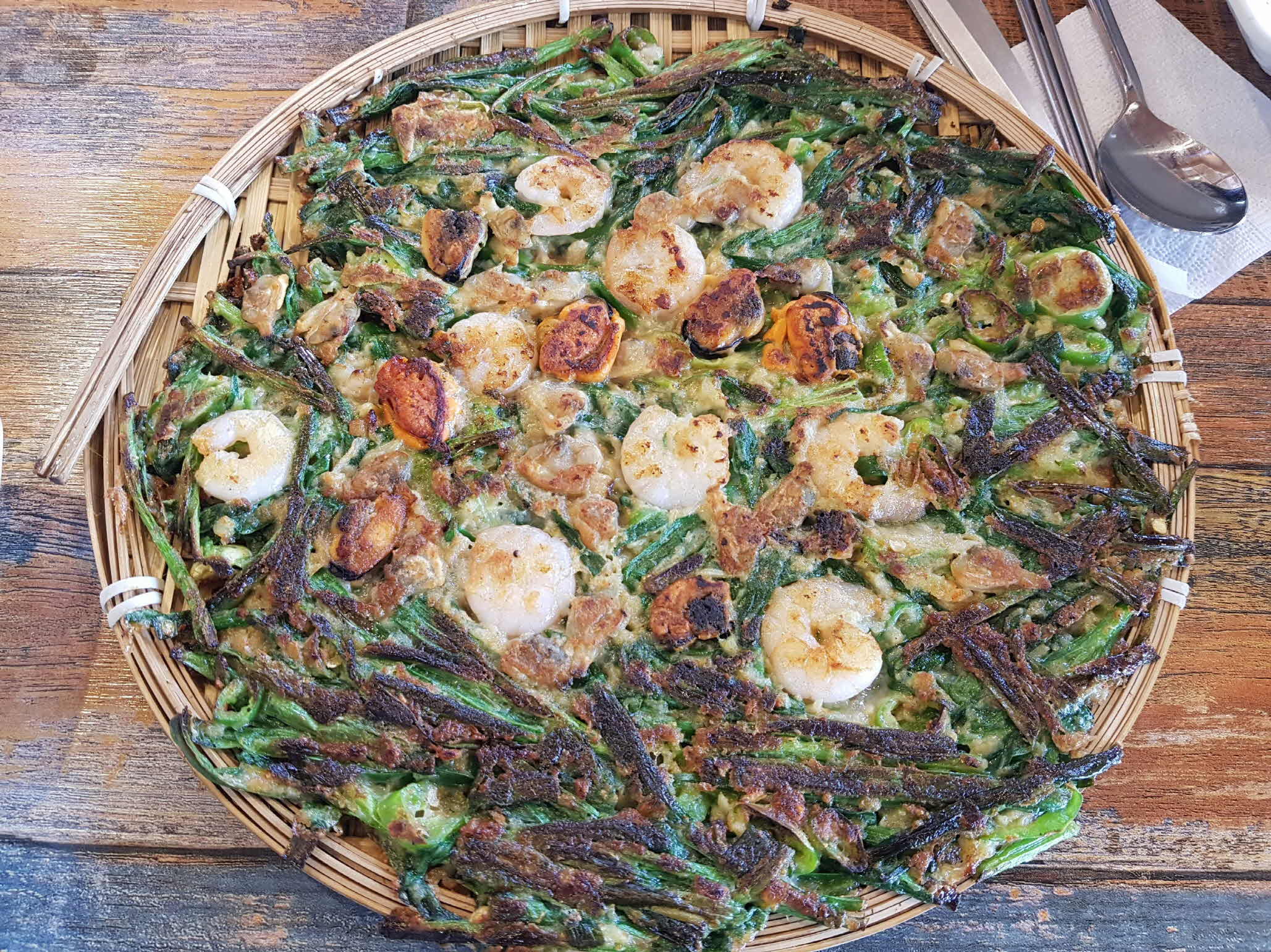 부추와 탱글한 해물이 듬뿍 들어간 해물부추전.