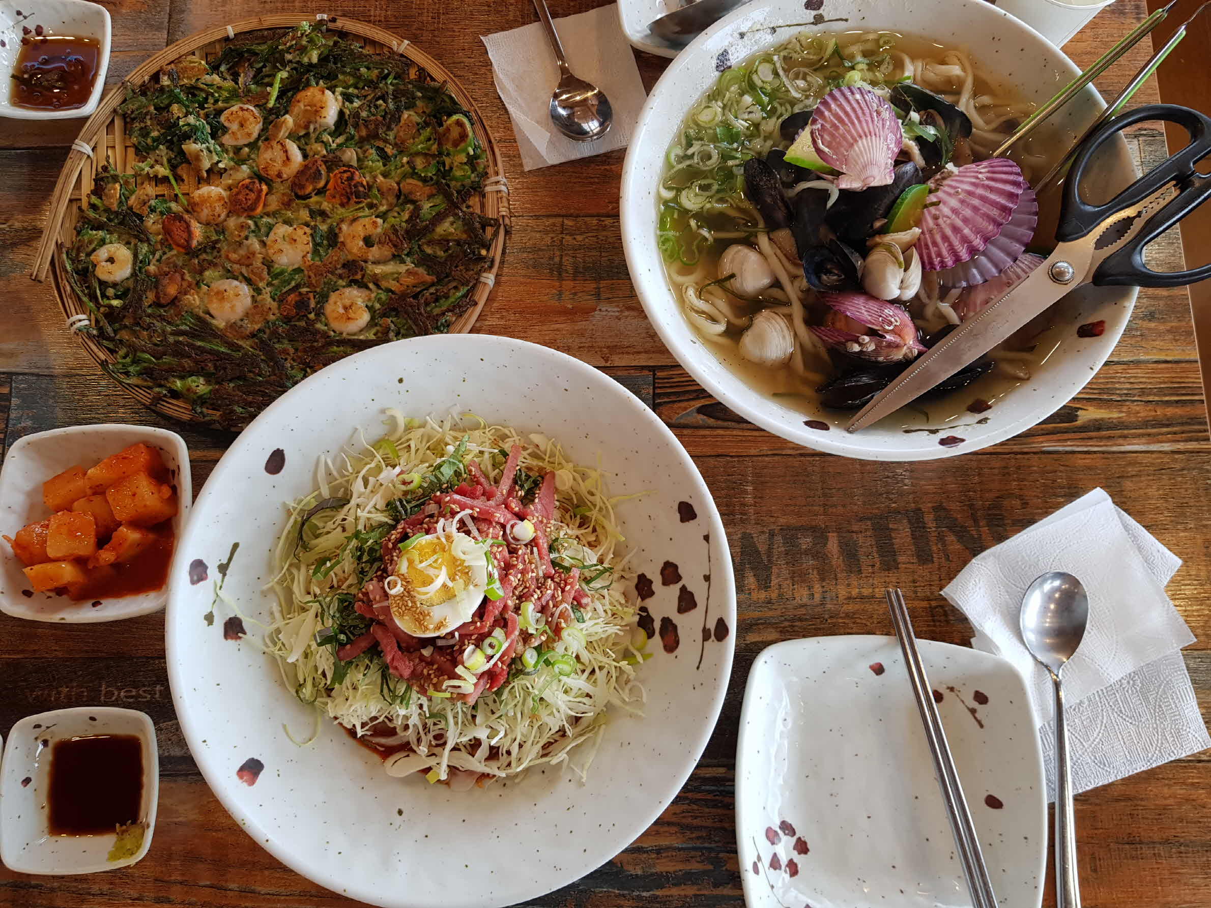 해물부추전과 육회비빔국수, 왕해물칼국수가 한번에 우르르 먹음직스럽게 차려진다.