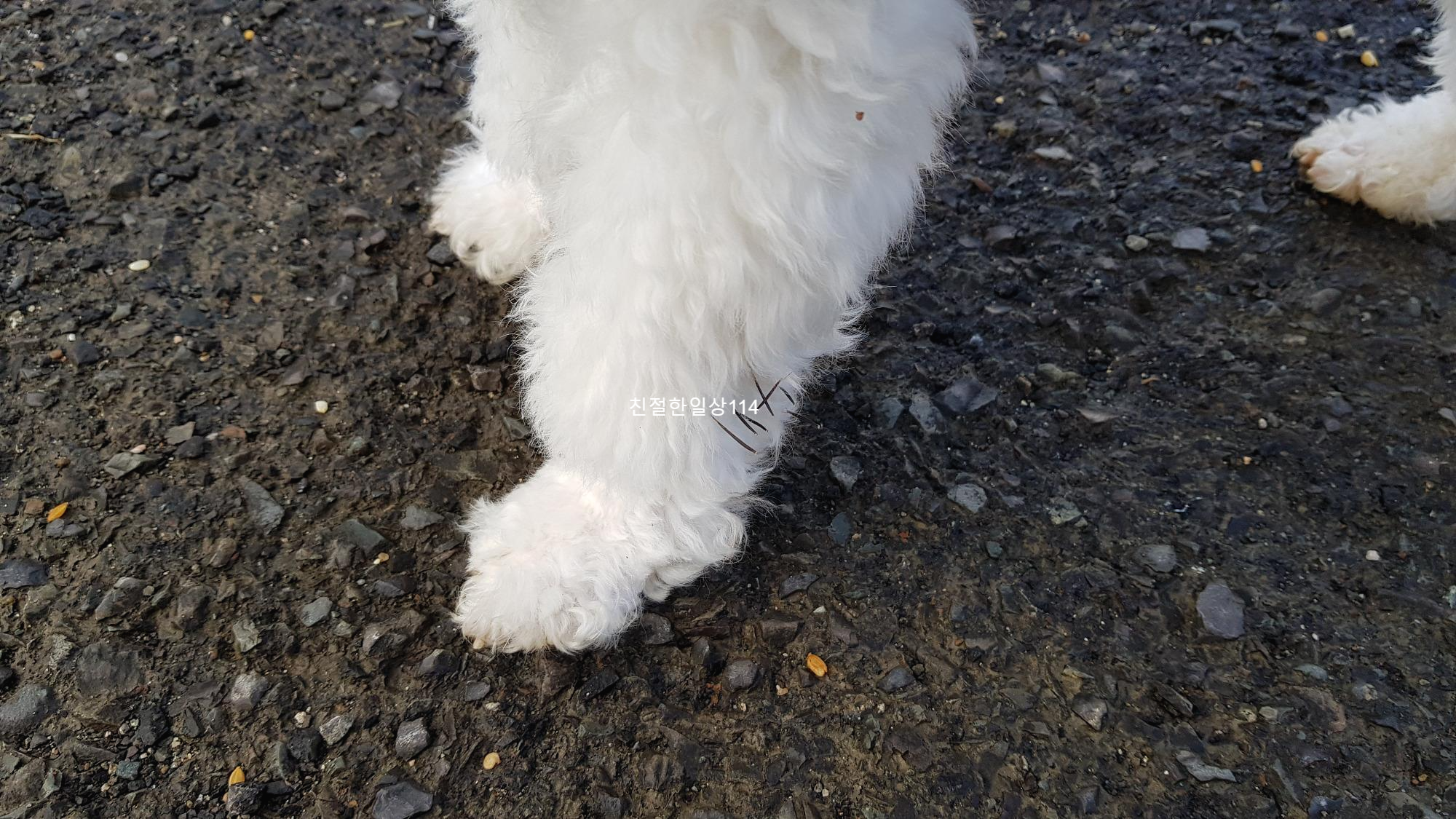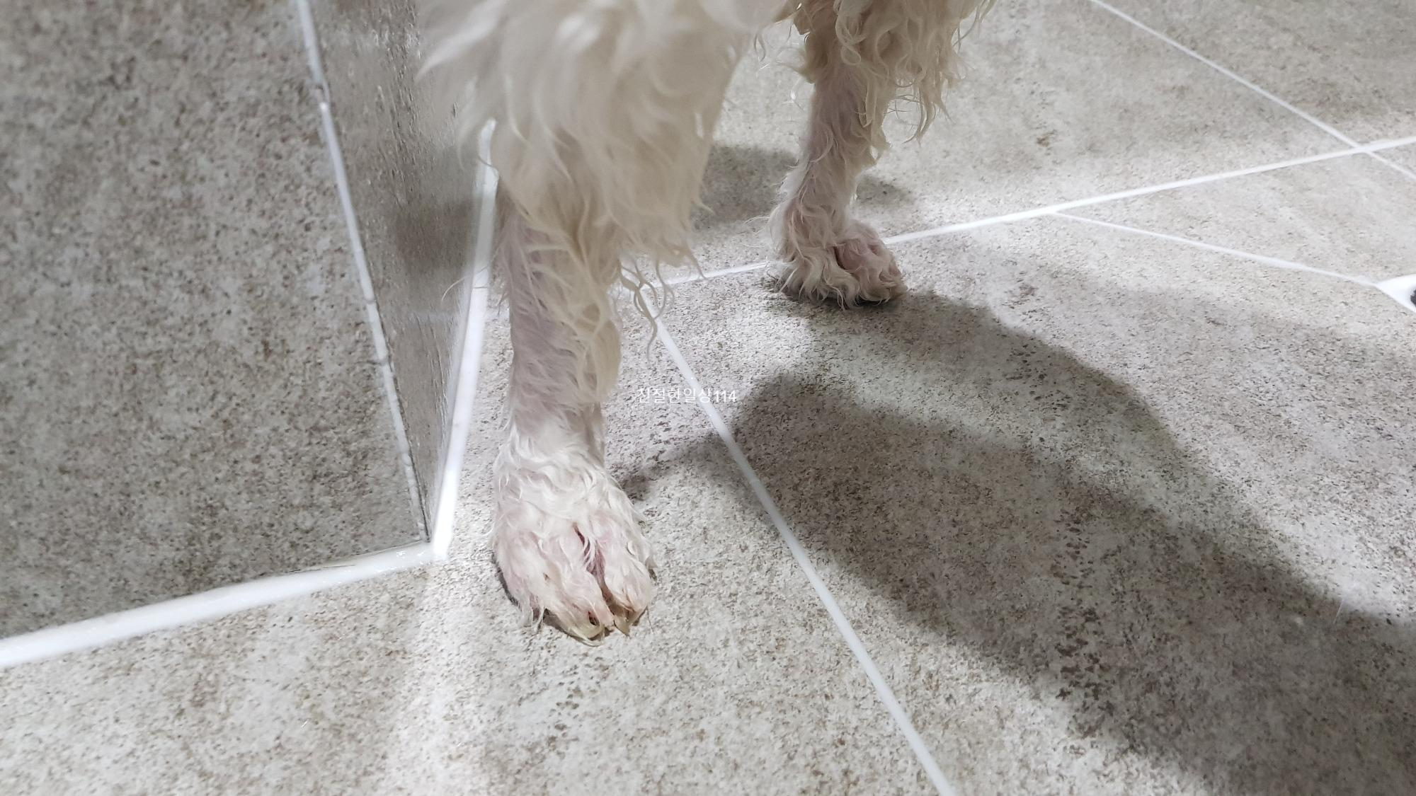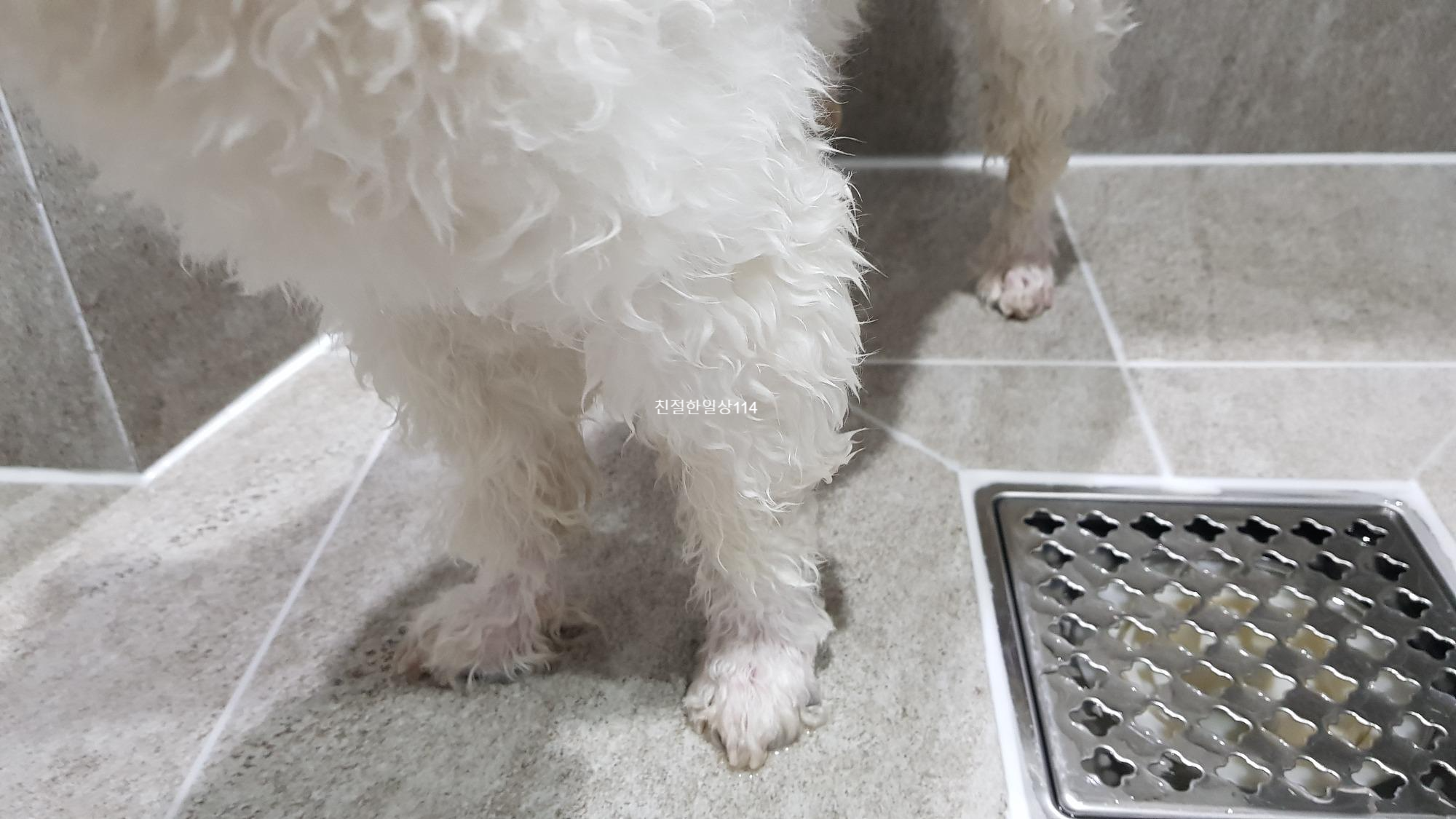 산책을 하면 발에 생각보다 많은 먼지나 이물질 들이 붙는다. 비숑프리제나 스피치 같이 털이 긴 견종은 더 그럴 것이다. 털에 엉켜있어 물로 씻긴다고해도 결국 손으로 떼야하는데 물이 젖게 되면 더 안떨어지게 되므로 잔 나뭇잎부터 조금 큰 먼지 같은 이물질들은 손으로 뗄 수 있는 한 털어내고 제거해서 목욕에 들어가는 것이 좋다.