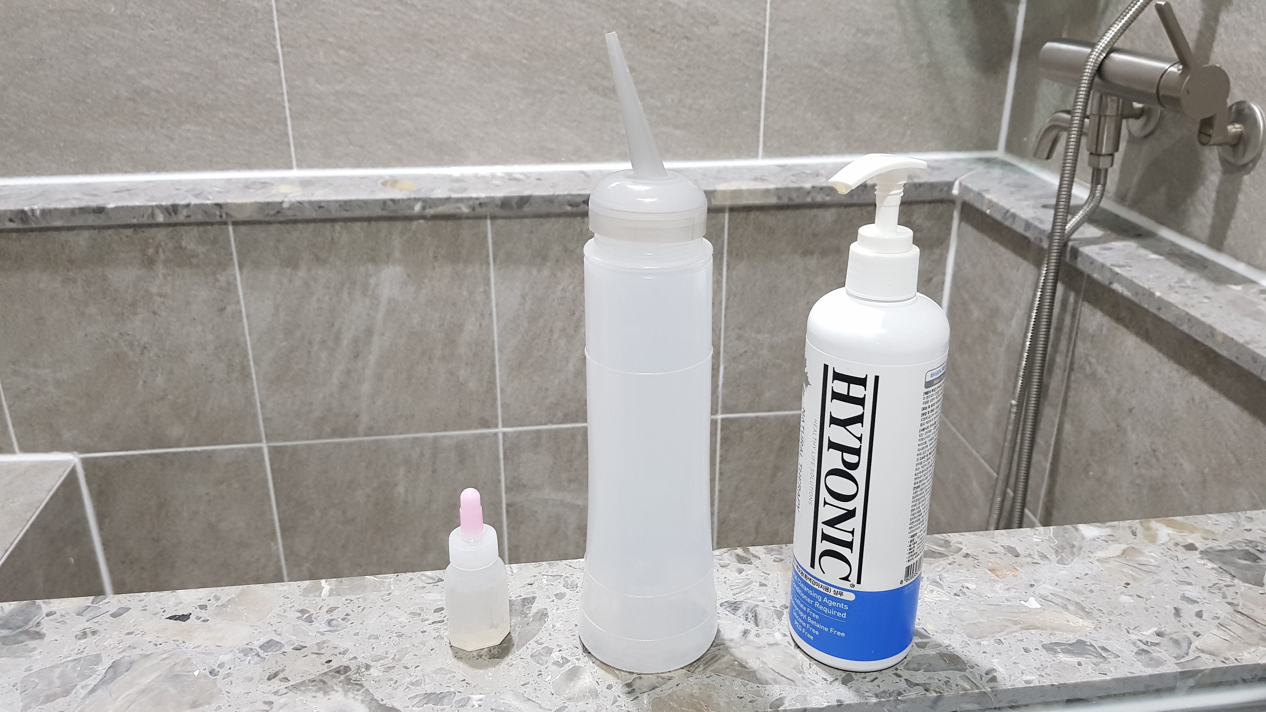 샴푸는 큰 샴푸통에 있는걸 그대로 사용하기보다는 물약병과 같은 작은 용기에 덜어 물과 희석시켜서 사용하는 것이 편리하고 좋다. 샴푸와 물의 비율은 5:5 로 섞어서 사용하고 있다. 목욕을 할때는 머리와 등 전체에 샴푸를 짜서 거품을 내주고 거기서 난 거품으로 나머지 부분을 샴푸해주면 된다. 발만 씻길 때는 발에 샴푸를 싸서 손으로 쥐었다 폈다하면서 발가락 사이사이에도 때가 빠질 수 있도록 샴푸를 해준다.