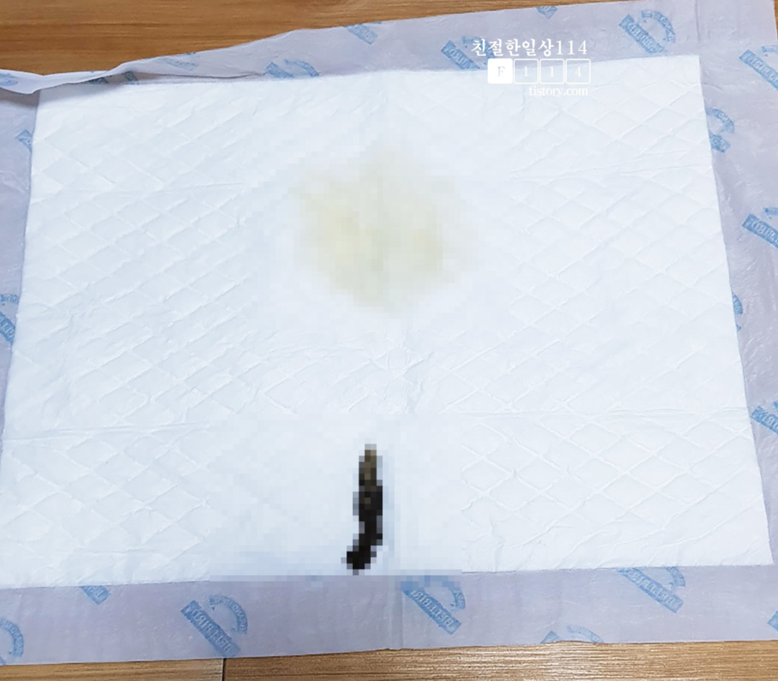 패드가 아닌 곳에서 응가하는 자세를 잡고 있으면 얼른 마늘이늘 들어서 패드로 옮겨보지만 옮기는 도중 후두둑 떨어진다.
