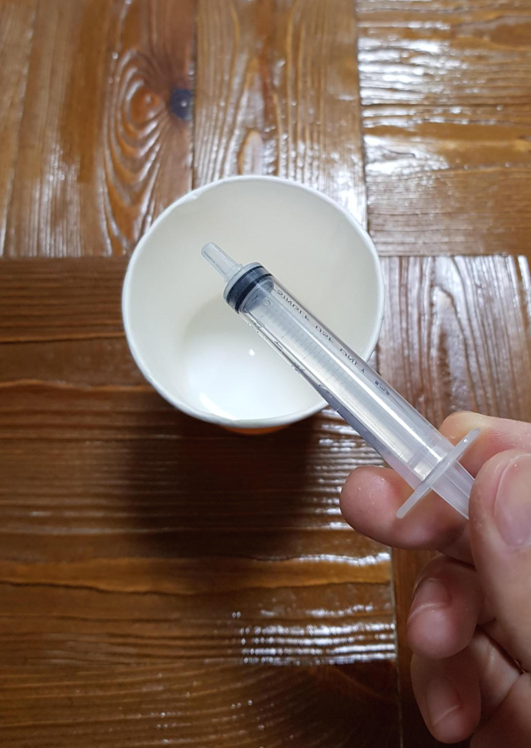 따뜻한 물을 종이컵에 받아 가루약을 녹여 주사기에 담는다. 여기서 중요한건 물을 최대한 적게해서 한두번에 먹일 수 있게 하는 것이다.