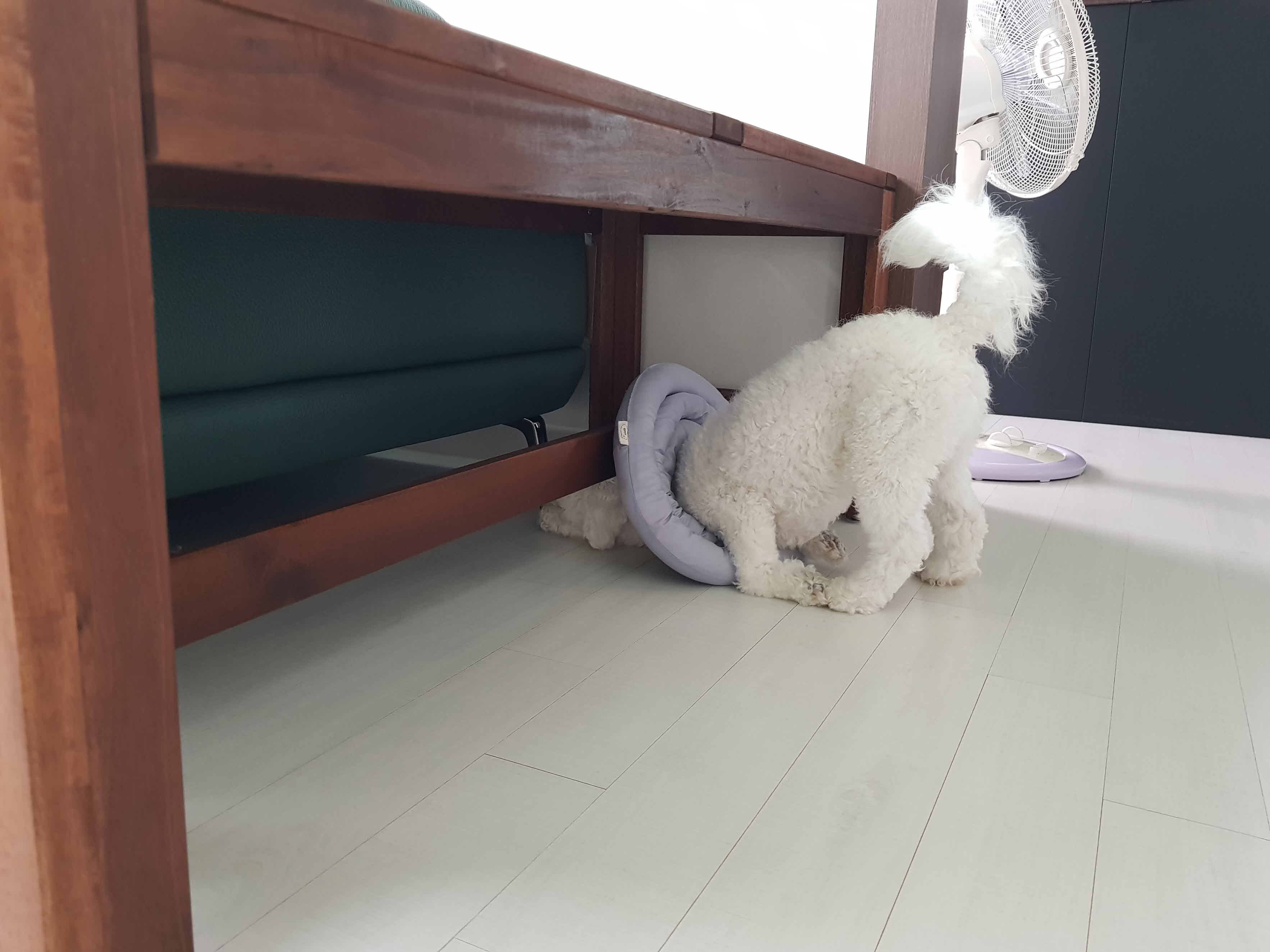 다시 넥카라를 채우고 2주를 더 지냈다. 이때부터는 넥카라가 익숙해져버려 베개처럼 사용하며 편하게 생활한다. 그리고 더 문제는 넥카라 재질이 딱딱하지 않고 천으로 되어있기에 조금만 힘을 주면 발을 핥을 수 있다는 것을 강아지가 알게 됐다는 것이다.