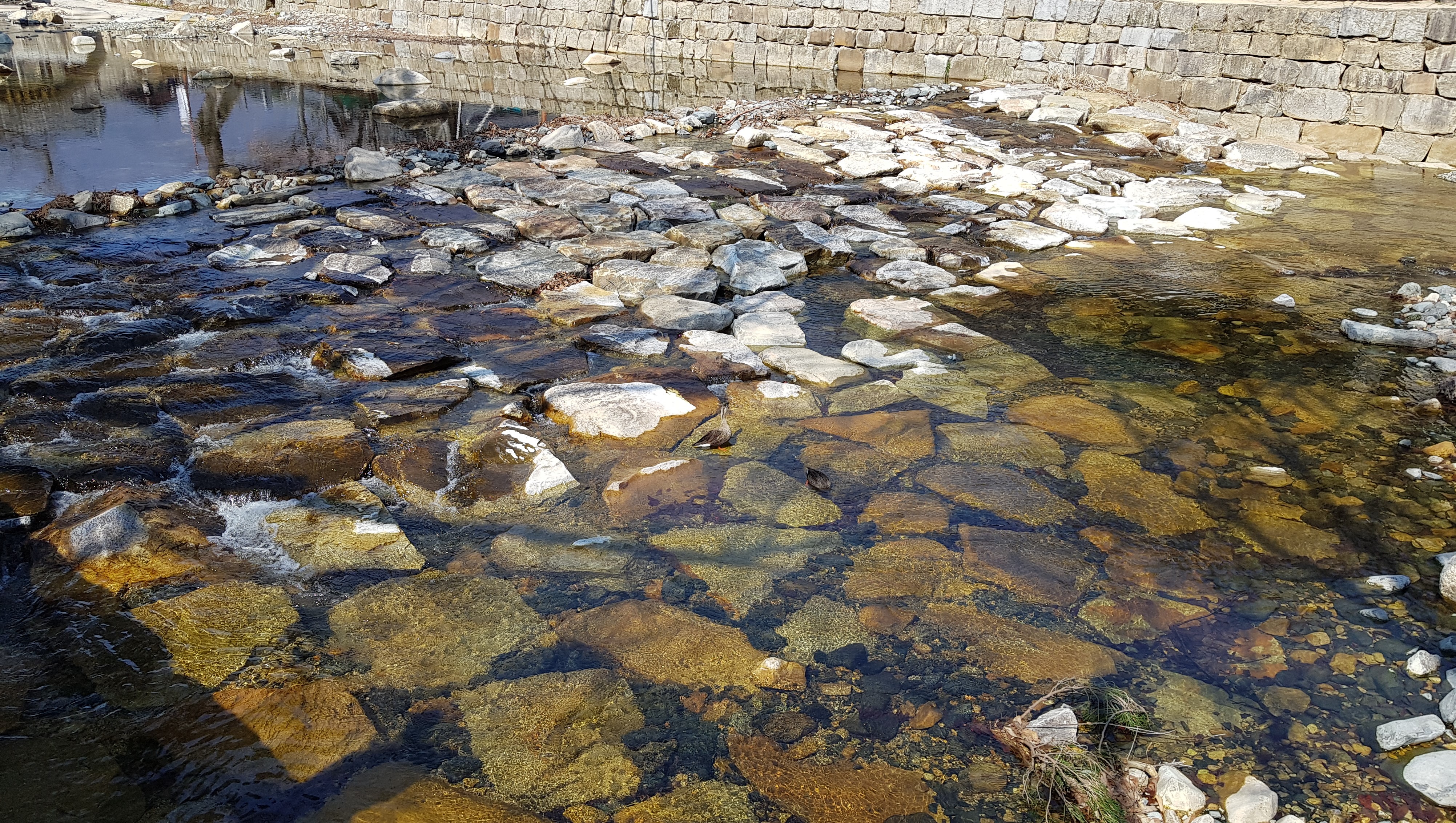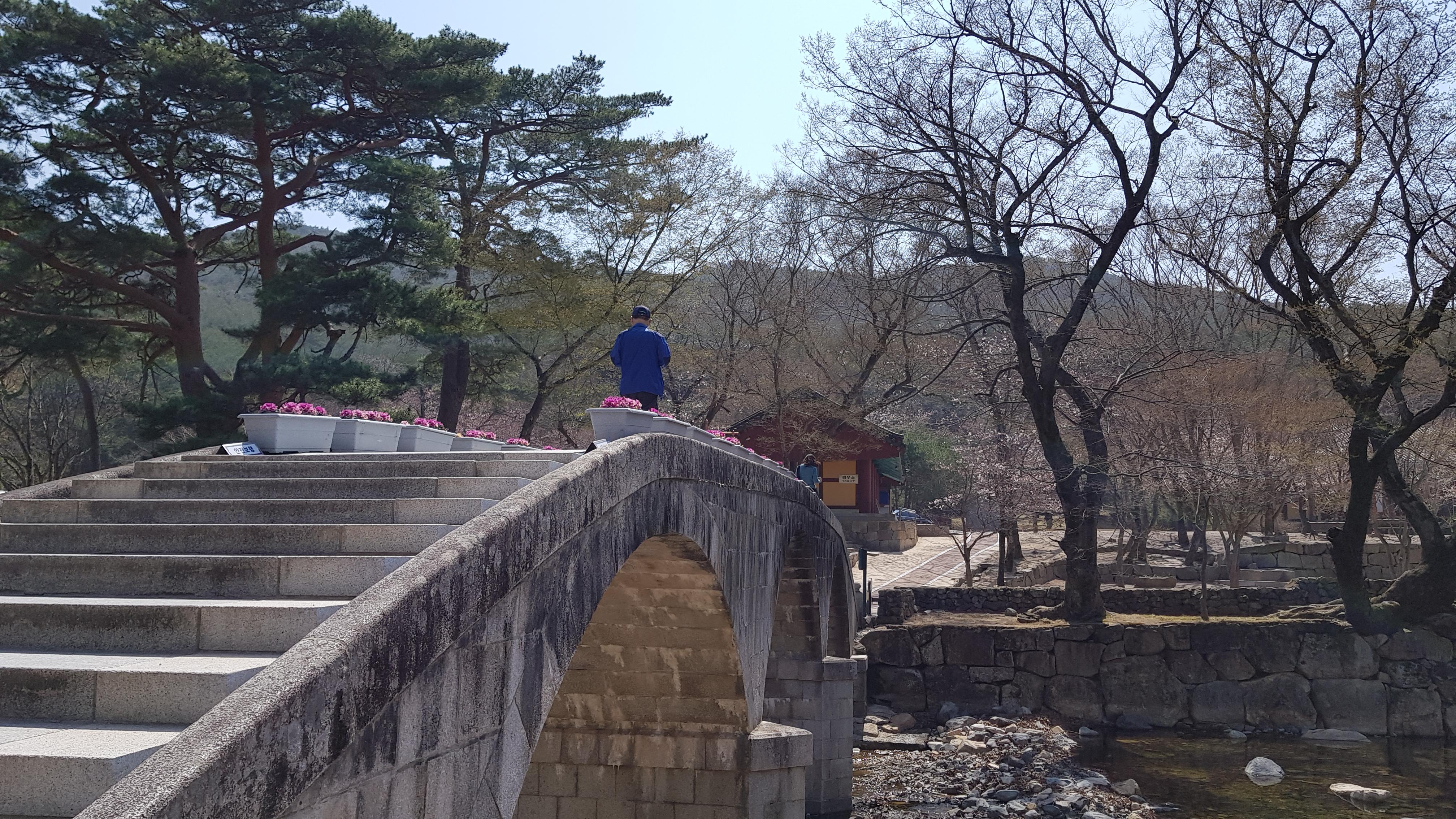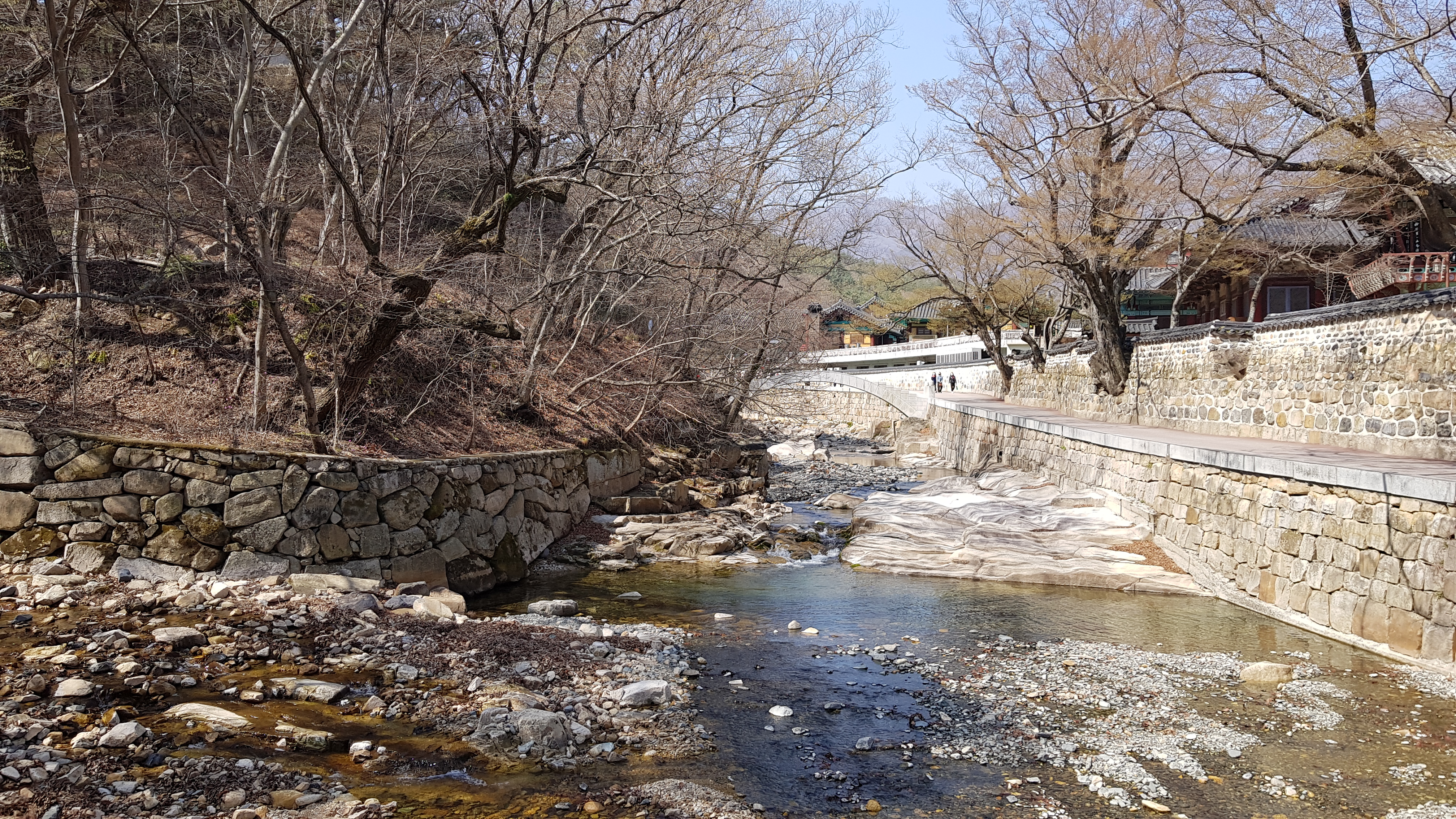 냇물가 양쪽으로 길이 나있고 앞쪽으로 양쪽길을 이어주는 돌다리가 보인다.