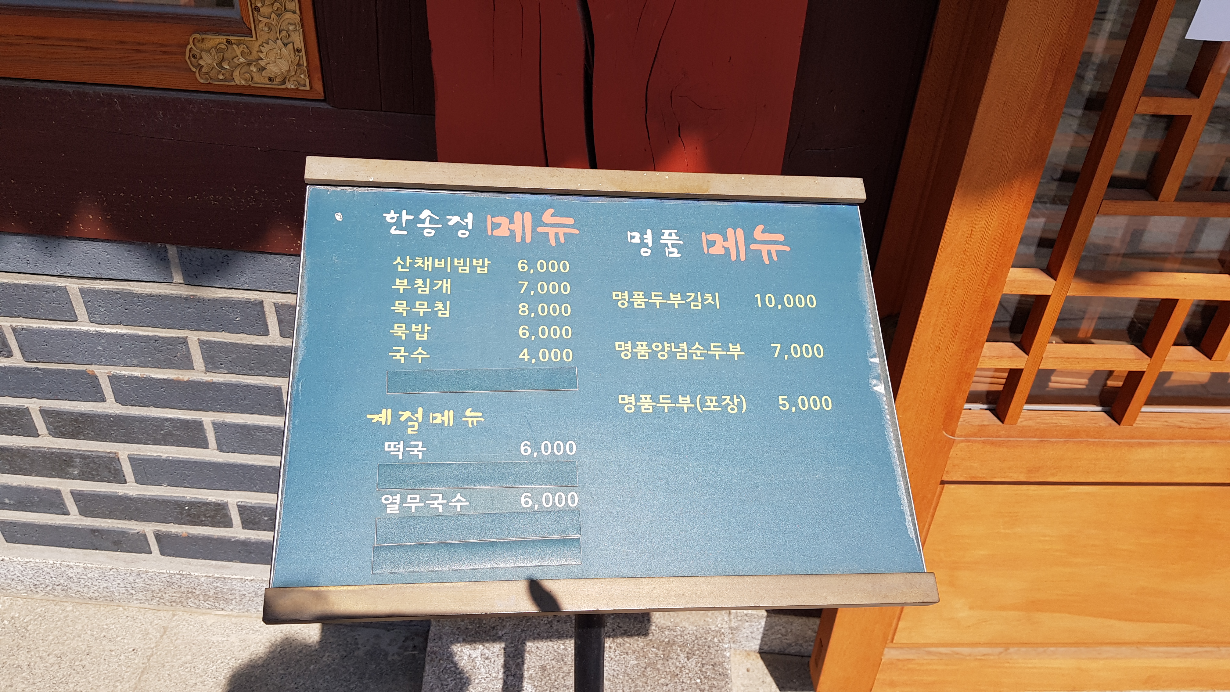 주차장에서 봤던 다정한식보다 산채비빔밥이 1,000원 저렴하다. 한송정은 메뉴는 적지만 두부요리가 특화된듯 하다.