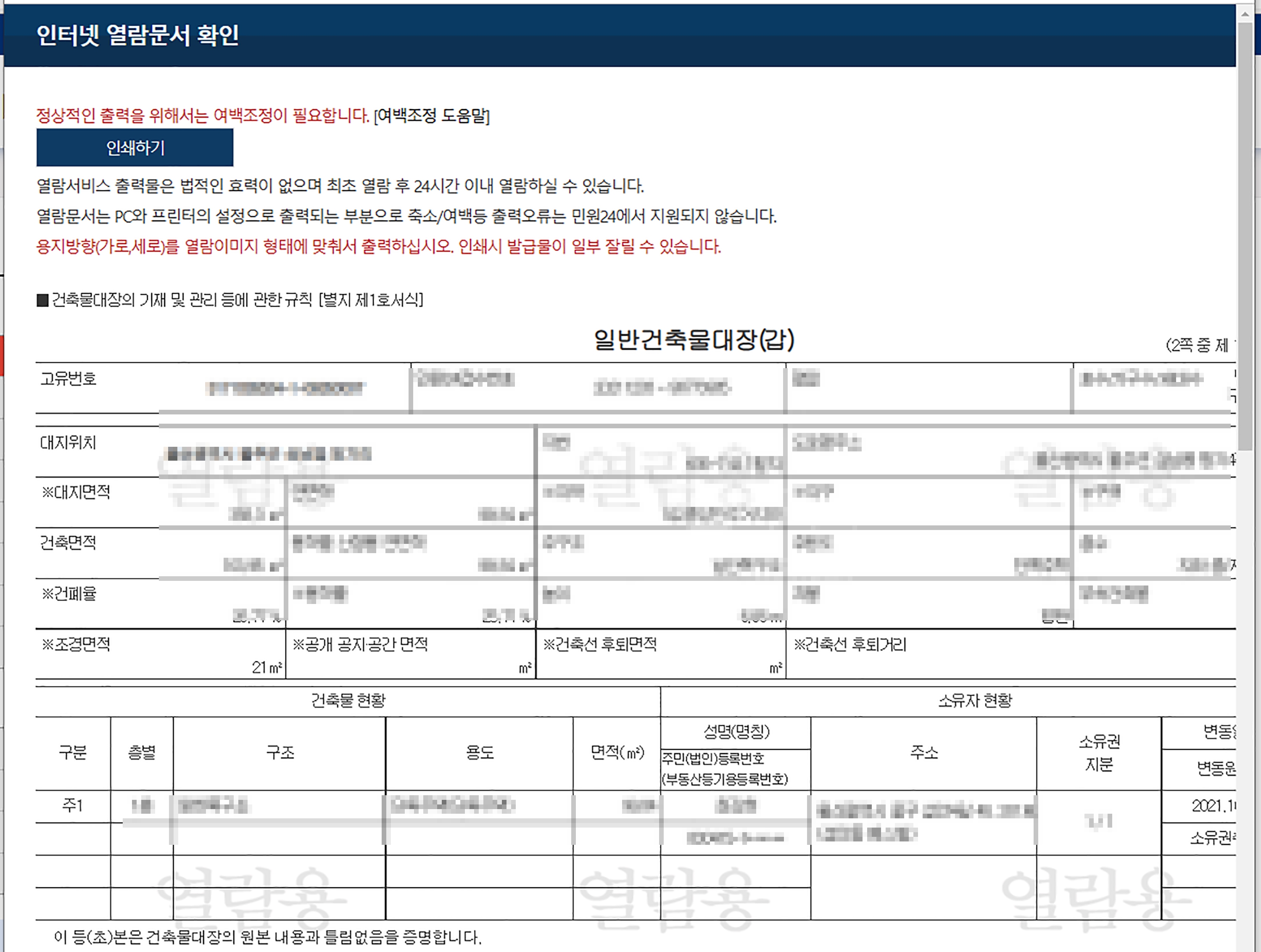 인쇄될 건출물대장의 화면이 뜨고 오른쪽 상단에 있는 '인쇄' 버튼을 클릭하면 인쇄가능한 프린트기가 뜨고 인쇄할 수 있다.
