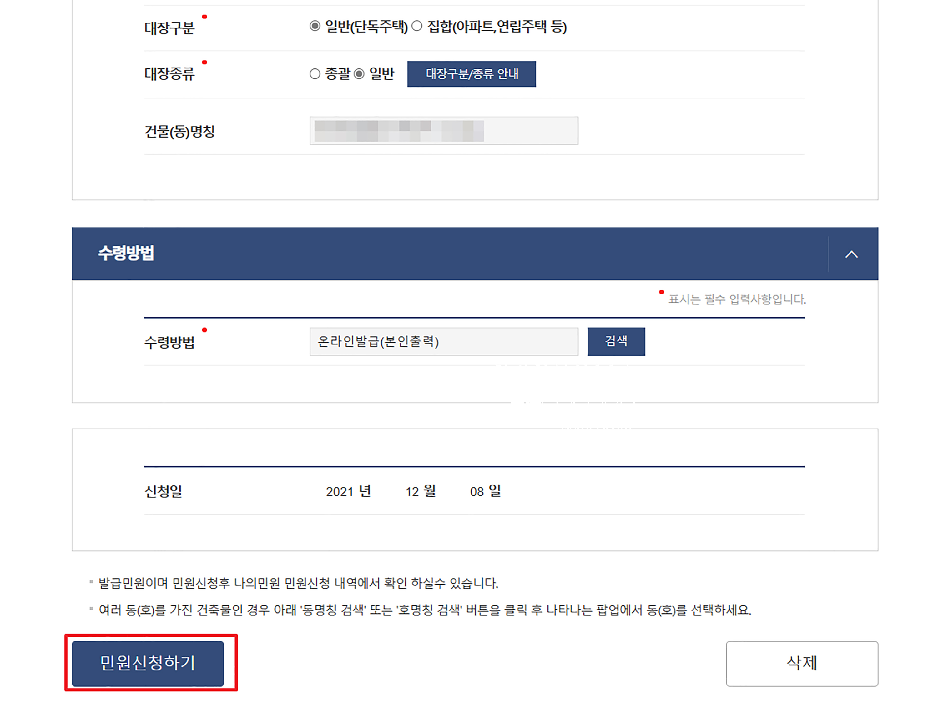 - 건축물대장 신청 접수 처리중 (처리시간 5~10초 소요)