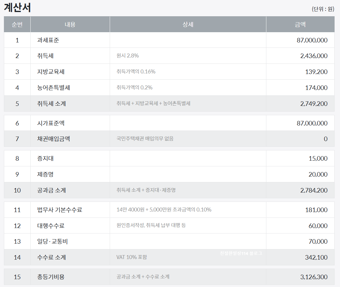 | 등기신청수수료: 15,000원 각종제증명서류 (건축물대장 및 주민등록초본 등): 1,200원 완료등기 우편발송비: 4,100원 법무사 등기 보수: 144,000 원 + 36,760 원 = 180,760 여비교통비: 50,000 원 ====================== 총비용: 251,060 원 |
