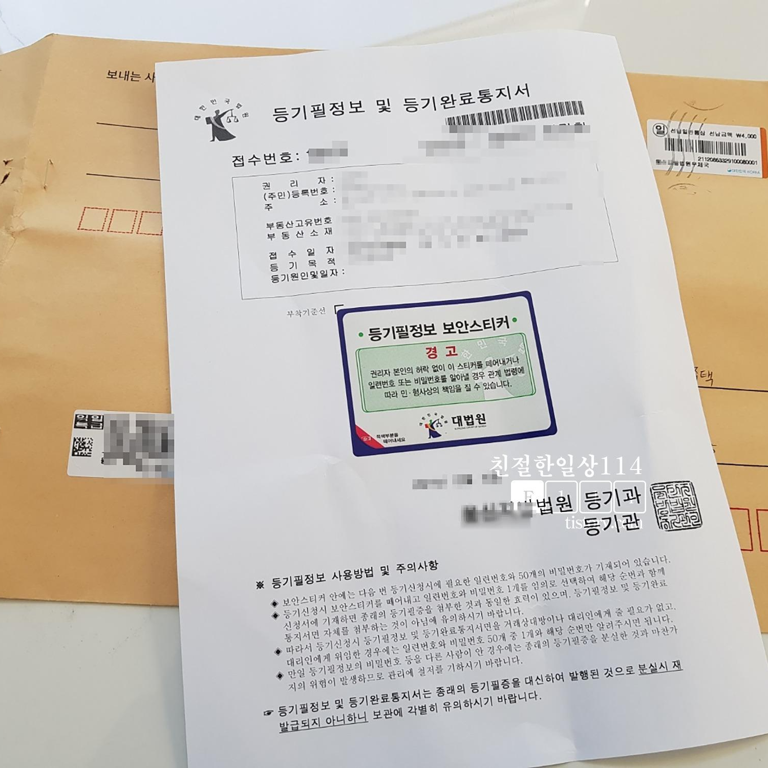 3번 등기 우편발송은 선택사항이다. 등기가 완료 되었을때 등기소에 직접 방문해서 수령해도 되고 우체국 등기우편으로 집에서 받아 볼 수도 있다. 우체국 등기 수수료는 4000원 + 대봉투 100원이며 다시 방문하기 어렵다면 해두는 것이 좋겠다. 이렇게 등기를 접수하고나면 이상이 없을시 보통 1주일 이내에 발급된다.