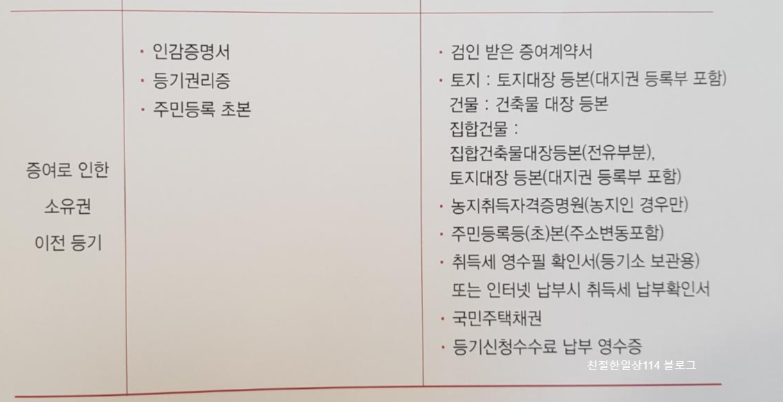 | 중여인 | - 인감증명서 - 등기권리증 - 주민등록초본 |