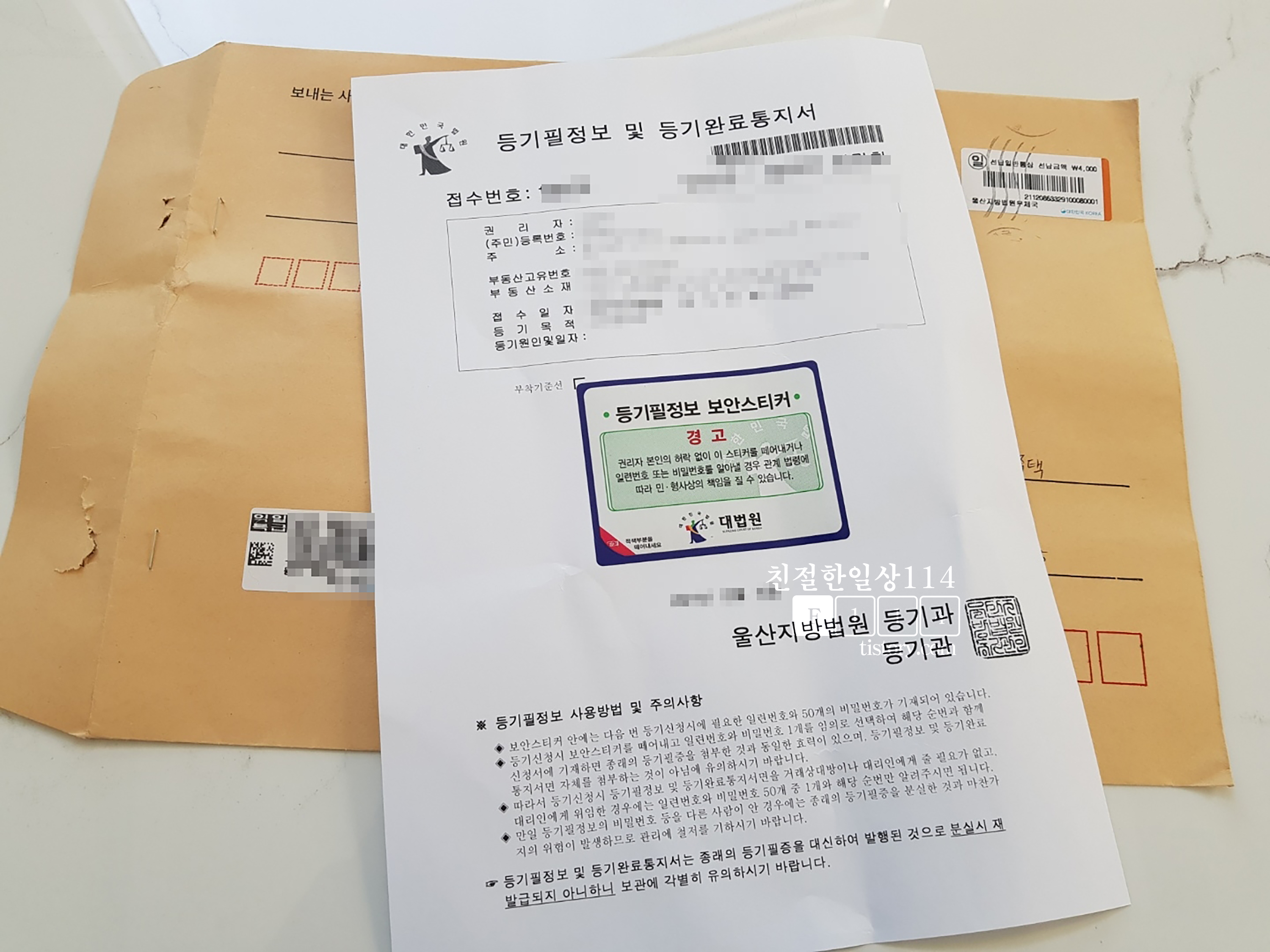 서류검토까지 마치고 등기소로 돌아가 1, 2번 창구에서 서류를 접수한다. 서류 접수를 하면서 등기가 완료되면 방문수령할지 우체국등기로 받아볼지 선택할 수 있다. 다시 등기소로 오기 번거로울것 같아서 우체국등기로 받기로 한다. 우체국등기로 받기위해서는 1층 우체국으로가서 등기발송용 대봉투와 우표를 사와야한다.