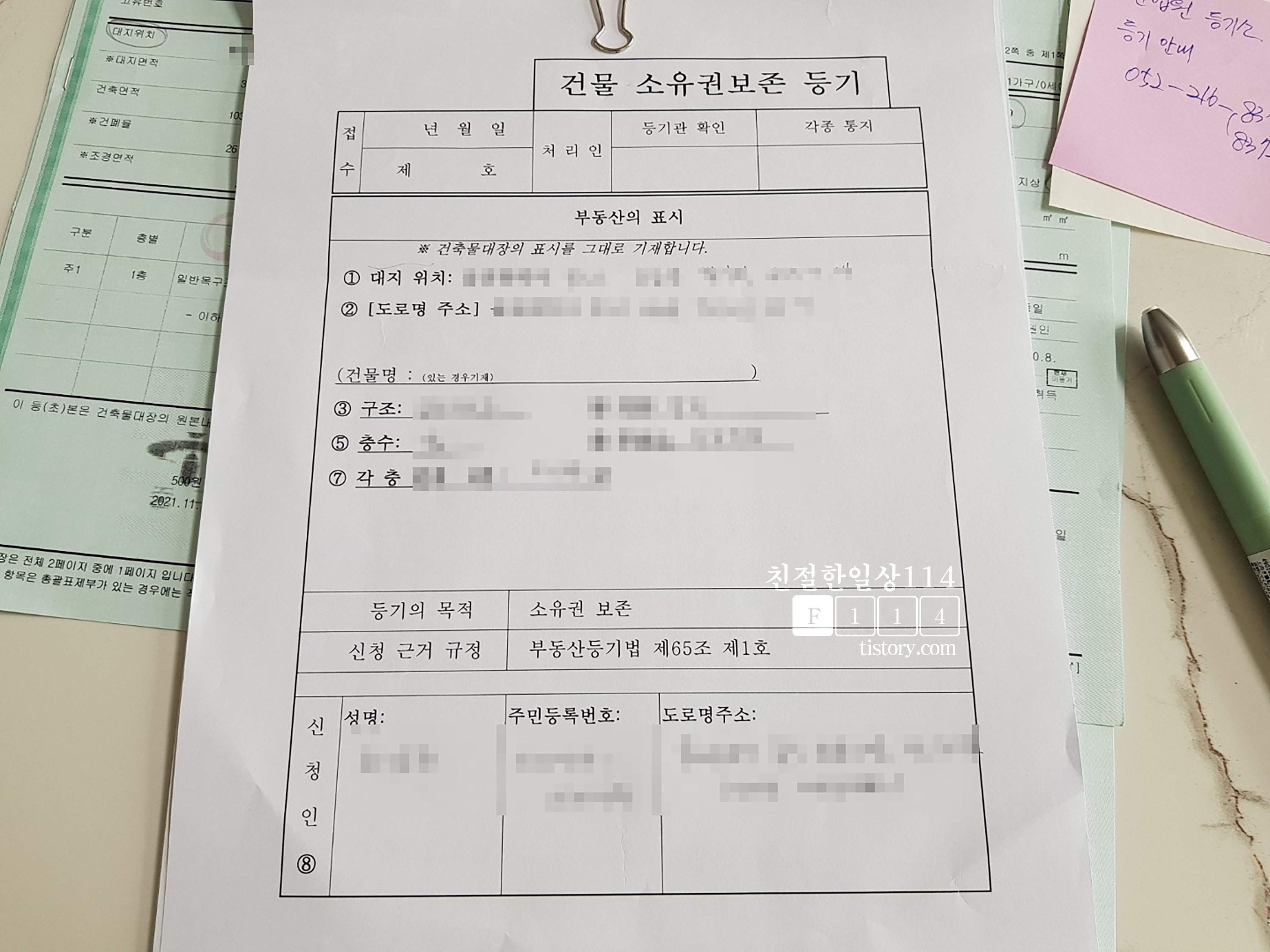 안내해주시는 분이 서류를 검토해보고는 건물 소유권보존 등기 신청서 작성 요령을 상세히 알려준다. 신청서를 건축물대장의 내용을 바탕으로 정확히 작성하고, 1층에 은행으로가서 등기신청수수료 납부 확인서를 붙여서 가져오라고 알려준다.