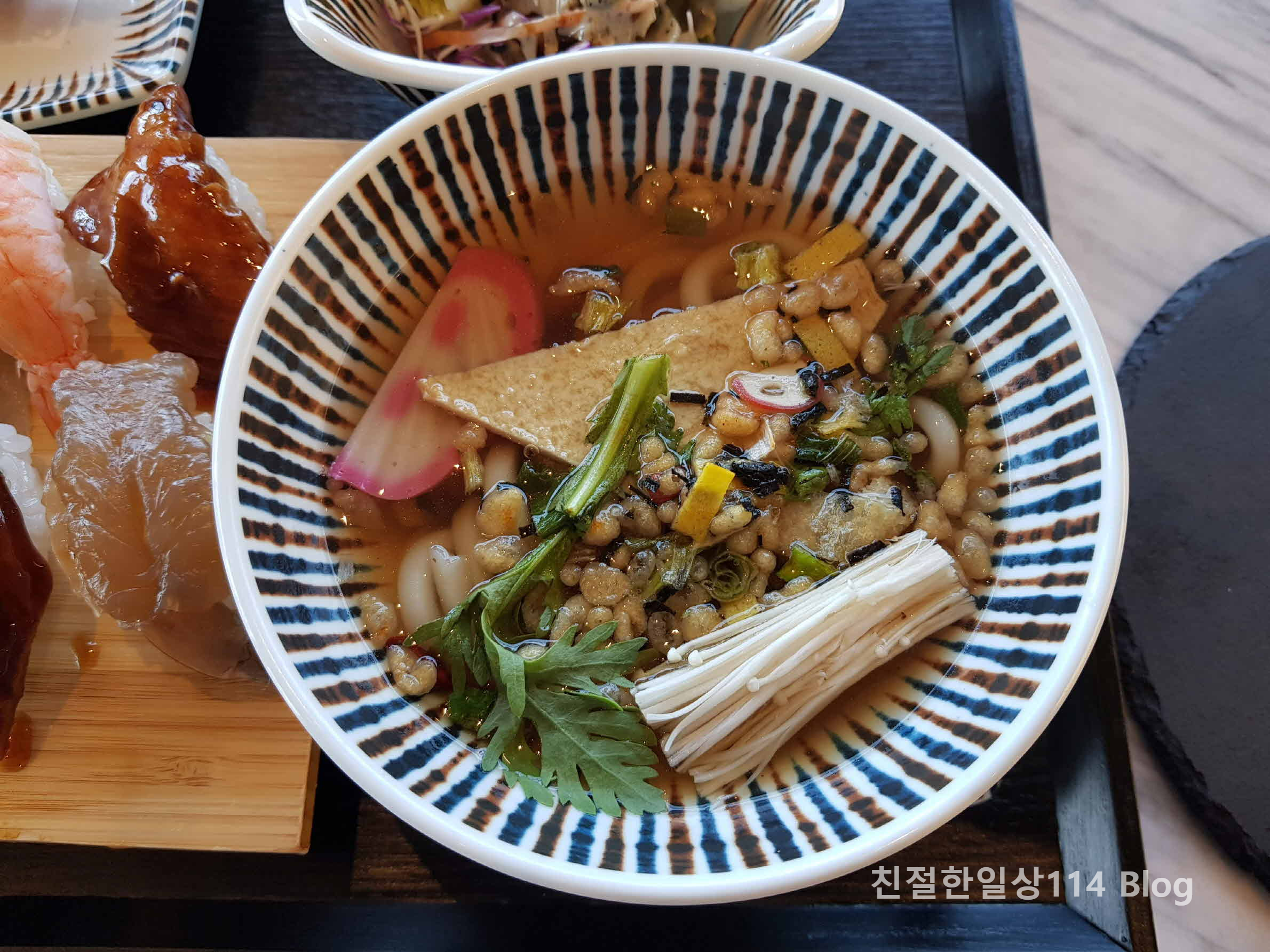 초밥을 먼저 먹느라 후식처럼 먹었던 미니우동이다. 늦게 먹었음에도 면이 불지 않고 탱글했으며 국물 맛도 진하고 맛있었다.