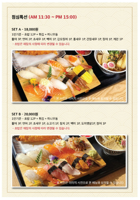 자리에 앉으니 직원분이 메뉴판을 가져다 준다. 점심특선 메뉴는11:30 ~ 15:00 까지 주문이 가능하고 여러종류 초밥과 튀김, 미니우동까지 있기에 SET B로 2인분을 주문한다.