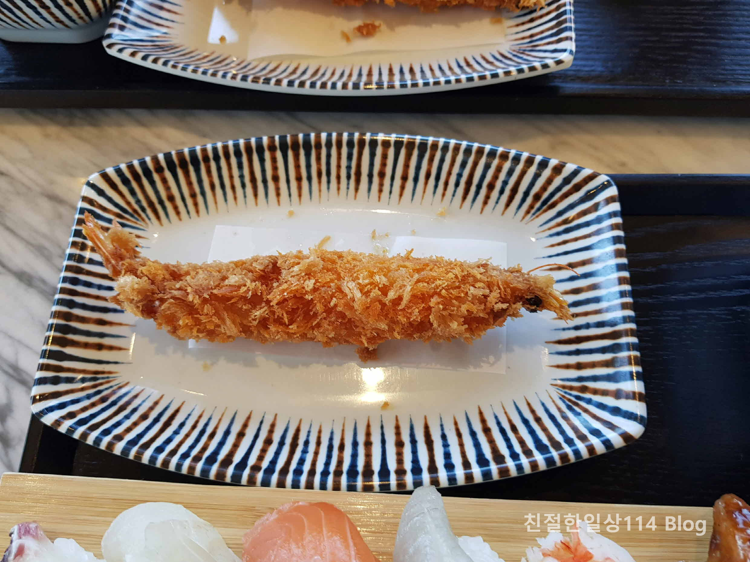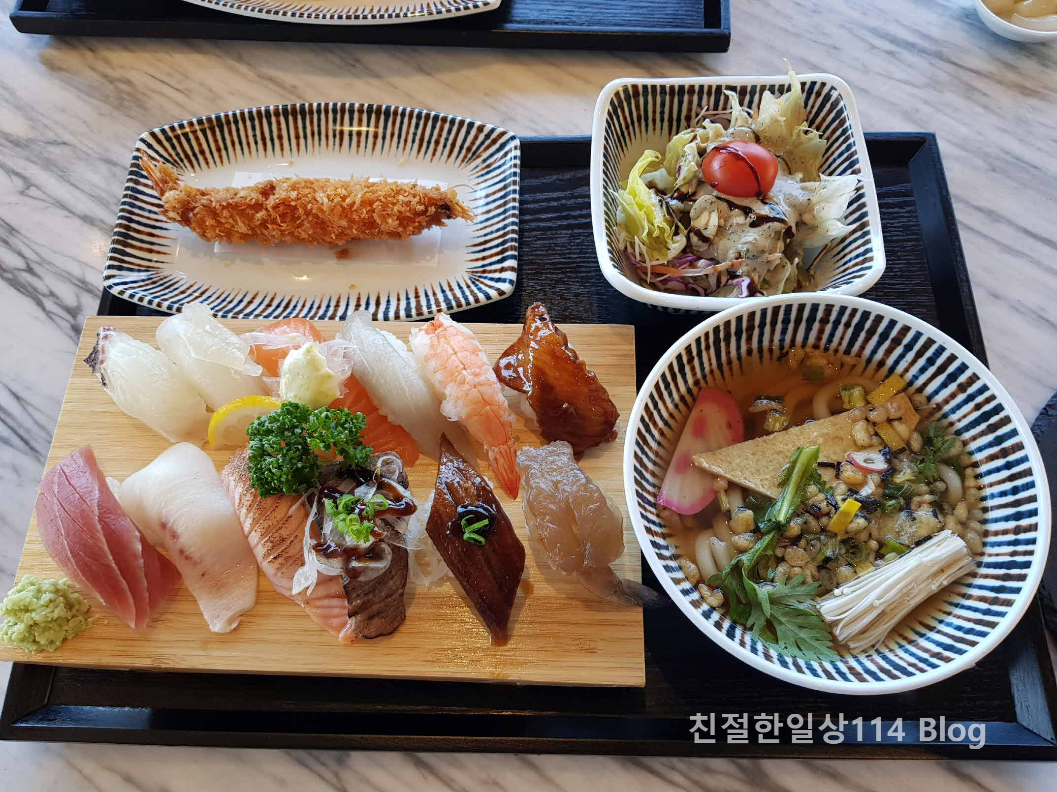 세트메뉴 구성은 초밥12p + 새우튀김 + 미니우동 + 샐러드 이렇게이며 이쁘고 정갈하게 담겨 나와 보기도 좋고 먹음직 스럽다.