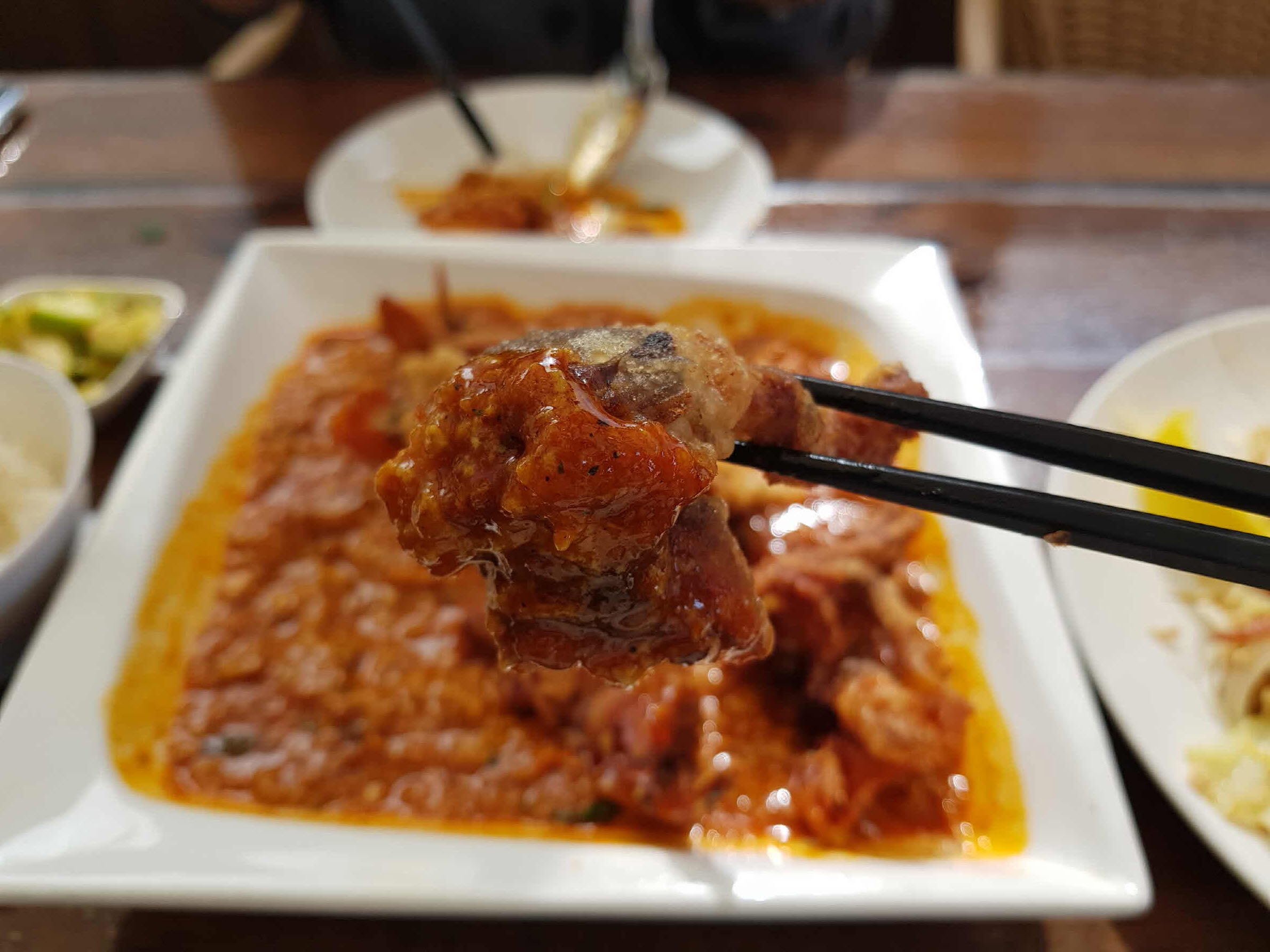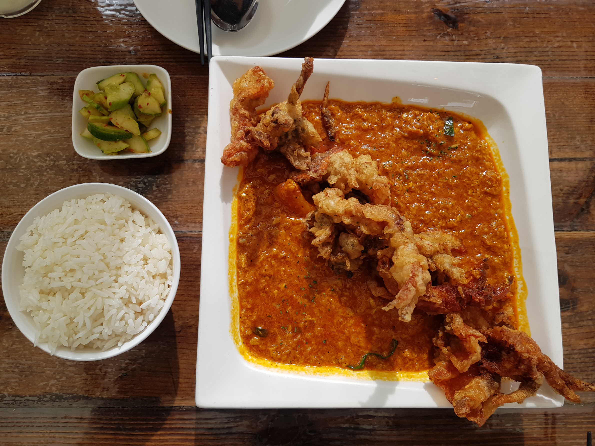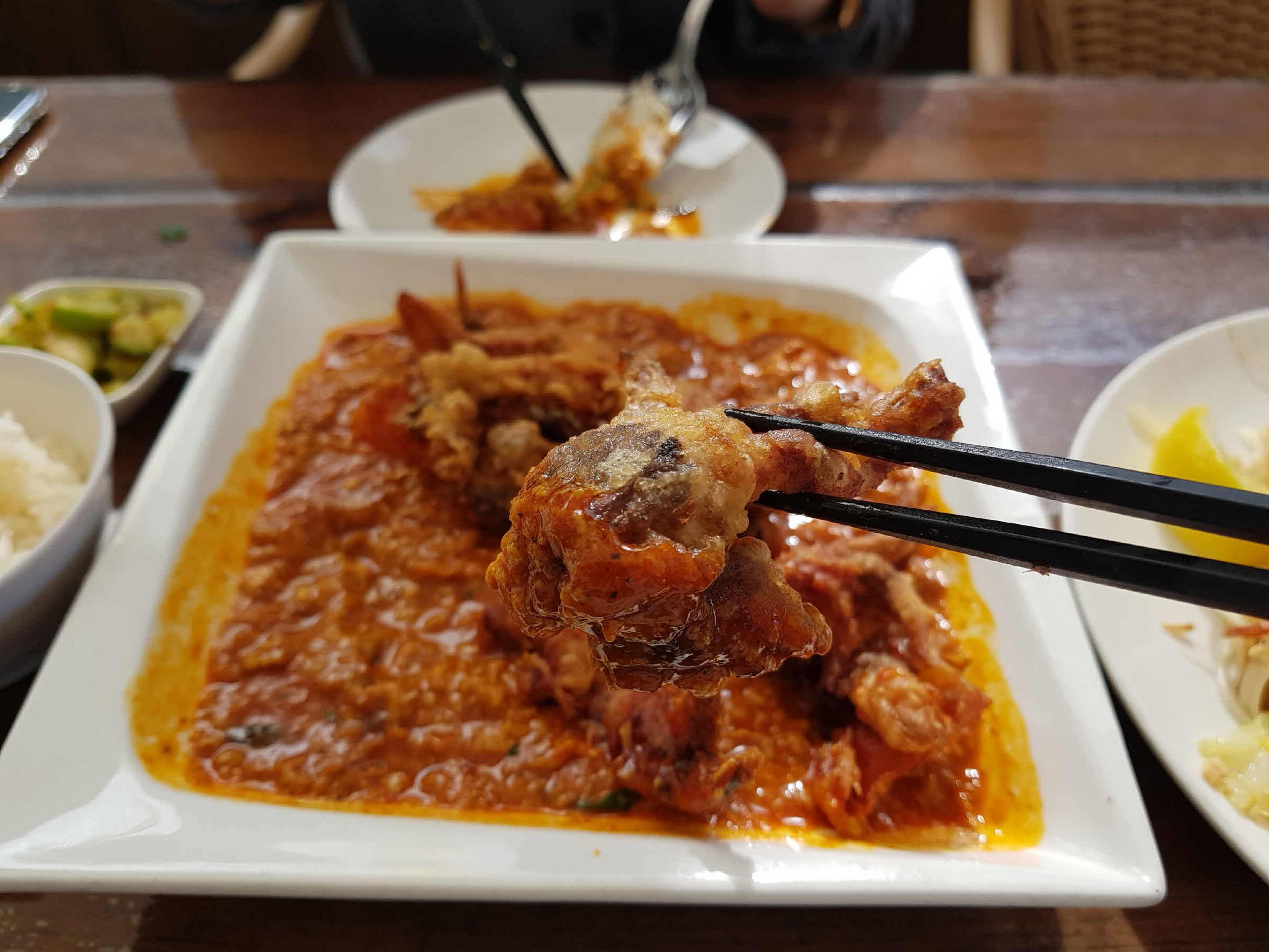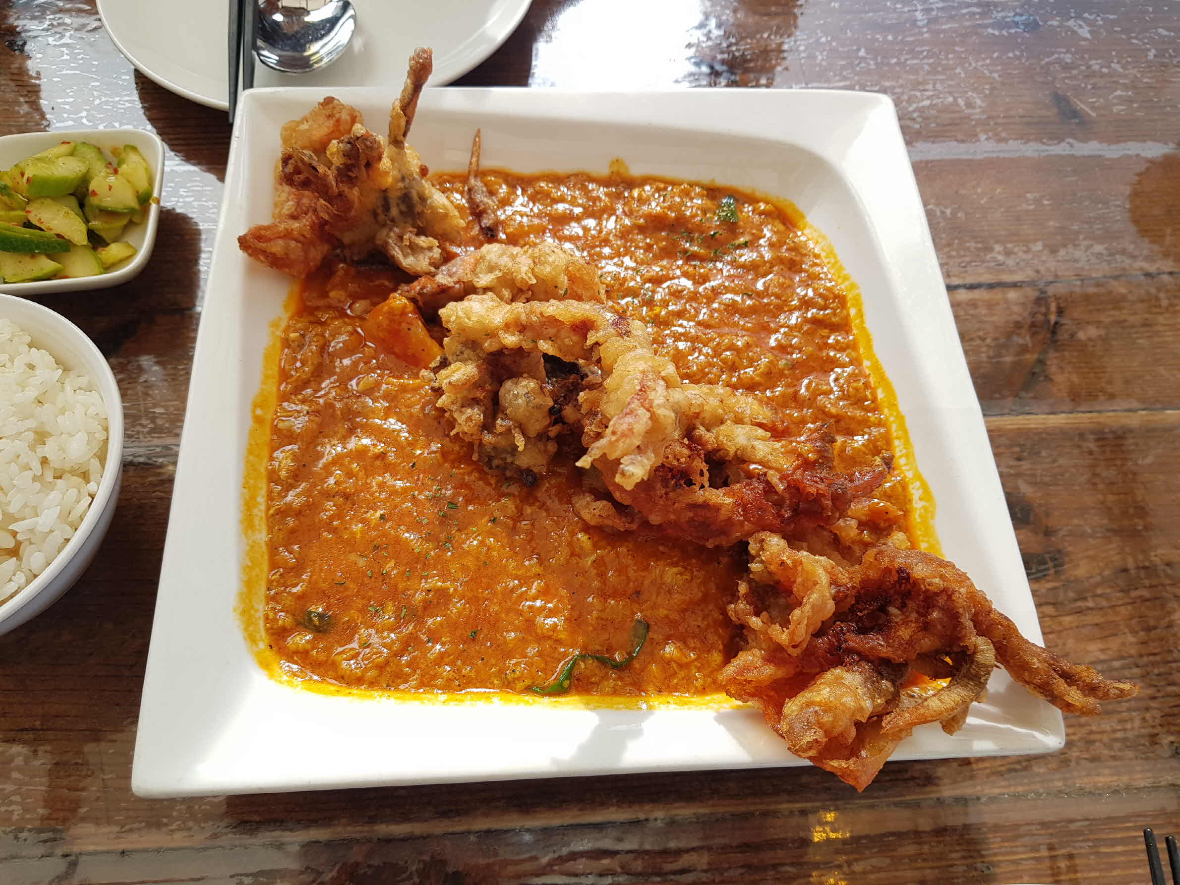 이어서 먼저 나온 뿌팟퐁커리. 약간 매콤한 카레와 그 위에 올려진 잘 튀겨진 게가 궁합이 잘 맞는다. 게는 생각보다 부드러워서 카레에 찍어서 바로 먹을 수 있다.