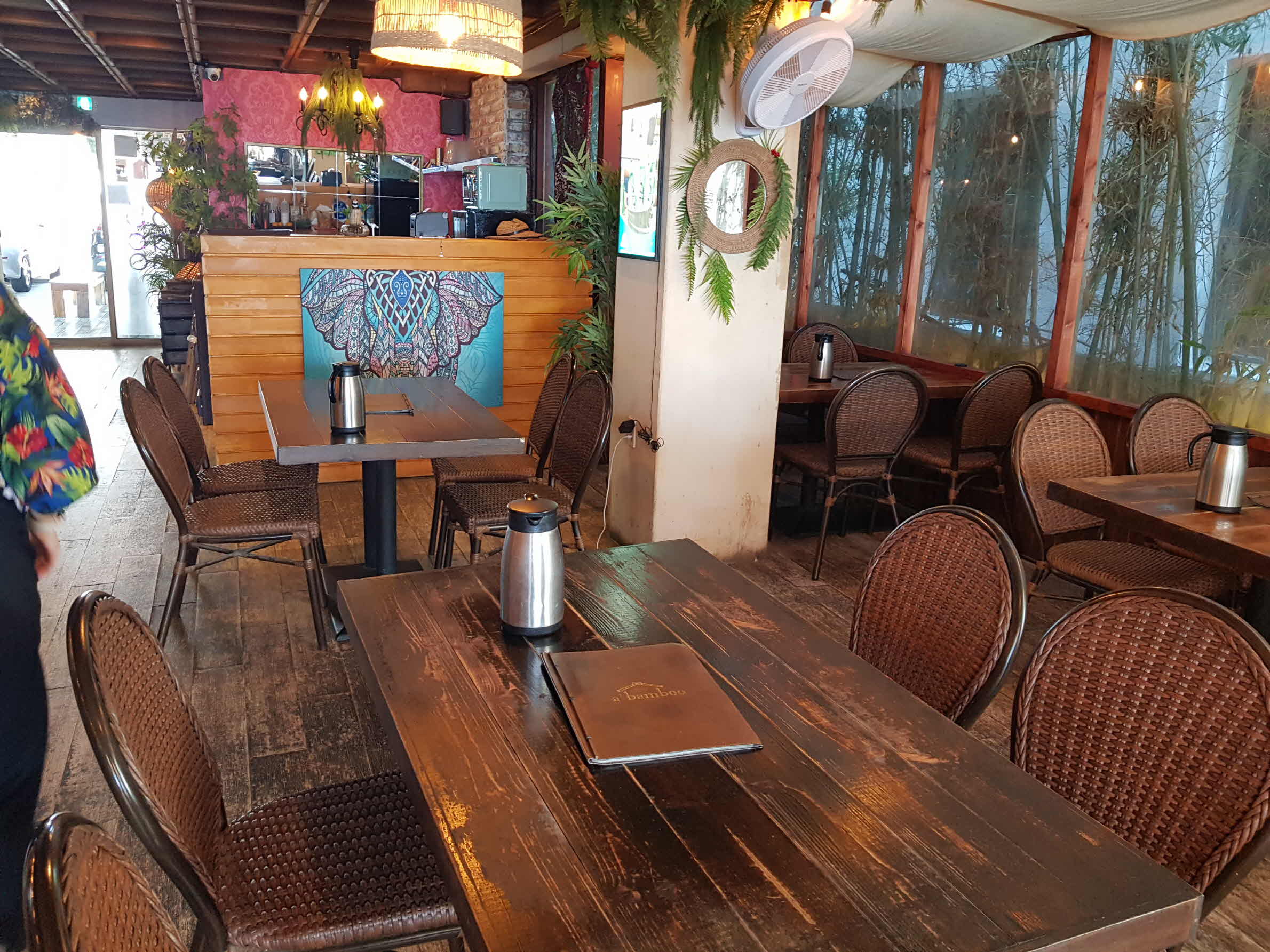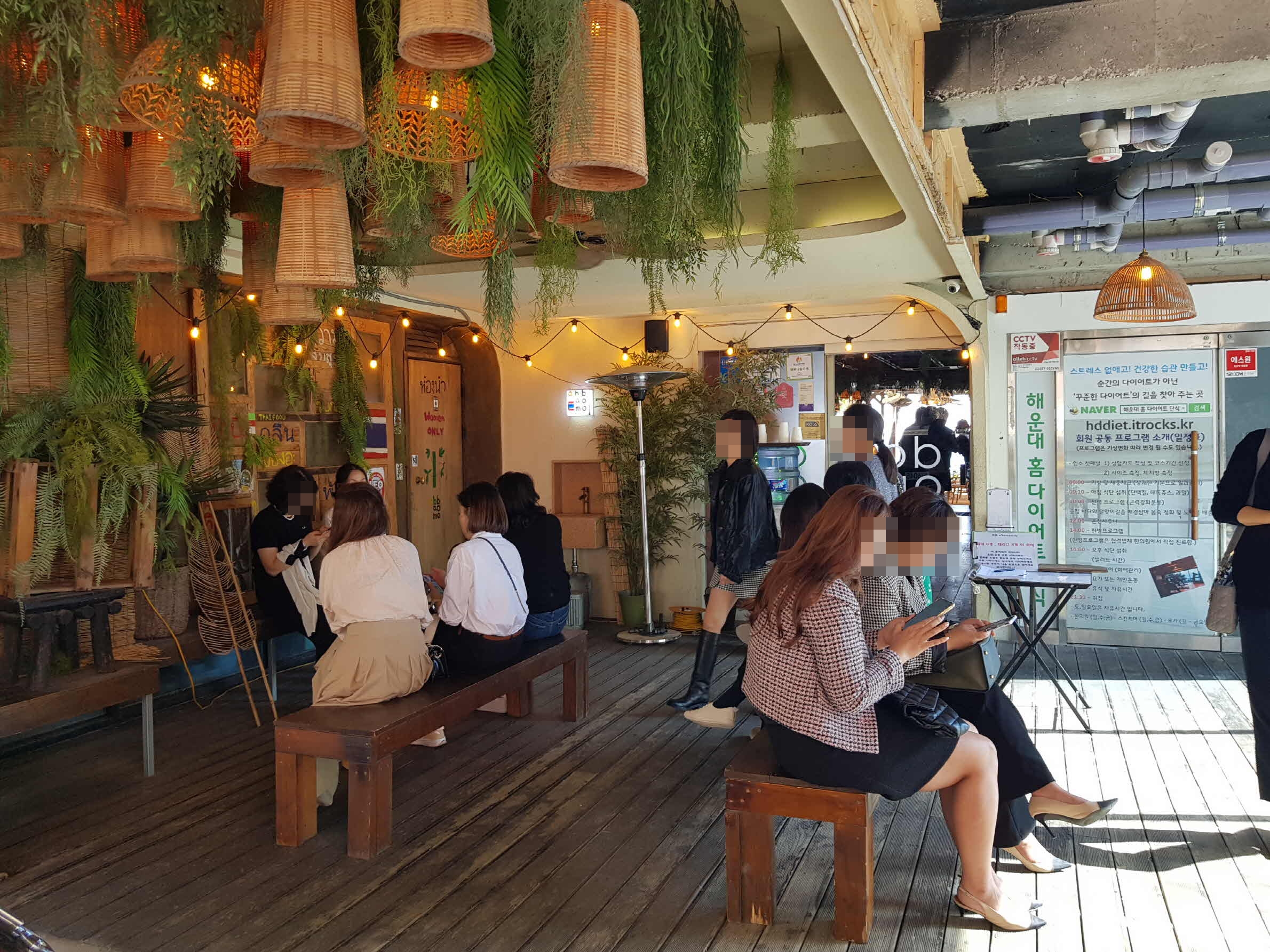 이곳이 야외 테라스 자리이다. 8개의 테이블이 있으며 바다 가까운 테이블이 인기가 많다. 앞으로는 야자수와 바다가 보이기 때문에 멋진 뷰를 볼 수도 있고 정말 태국에 온 듯 착각을 일으킬 정도이다. 멋진 바다뷰에 사람들이 사진을 찍기 분주하다.