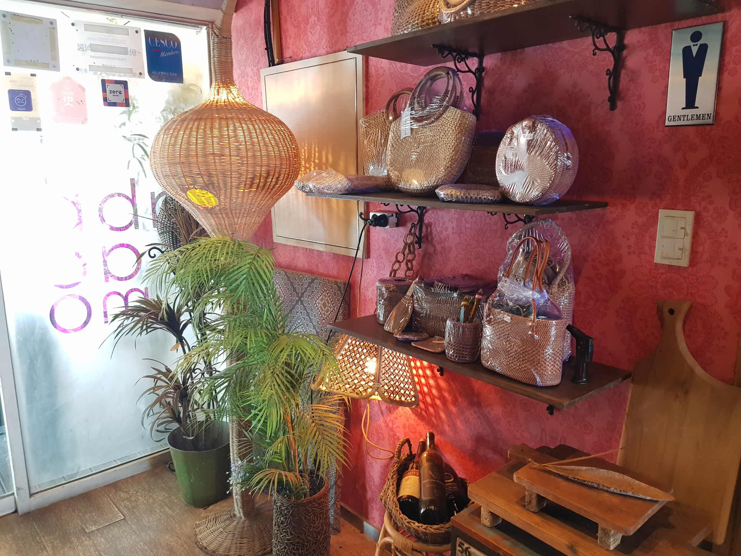 천장에도 라탄소재로 만든 조명갓이 이국적인 느낌을 주고 있다.