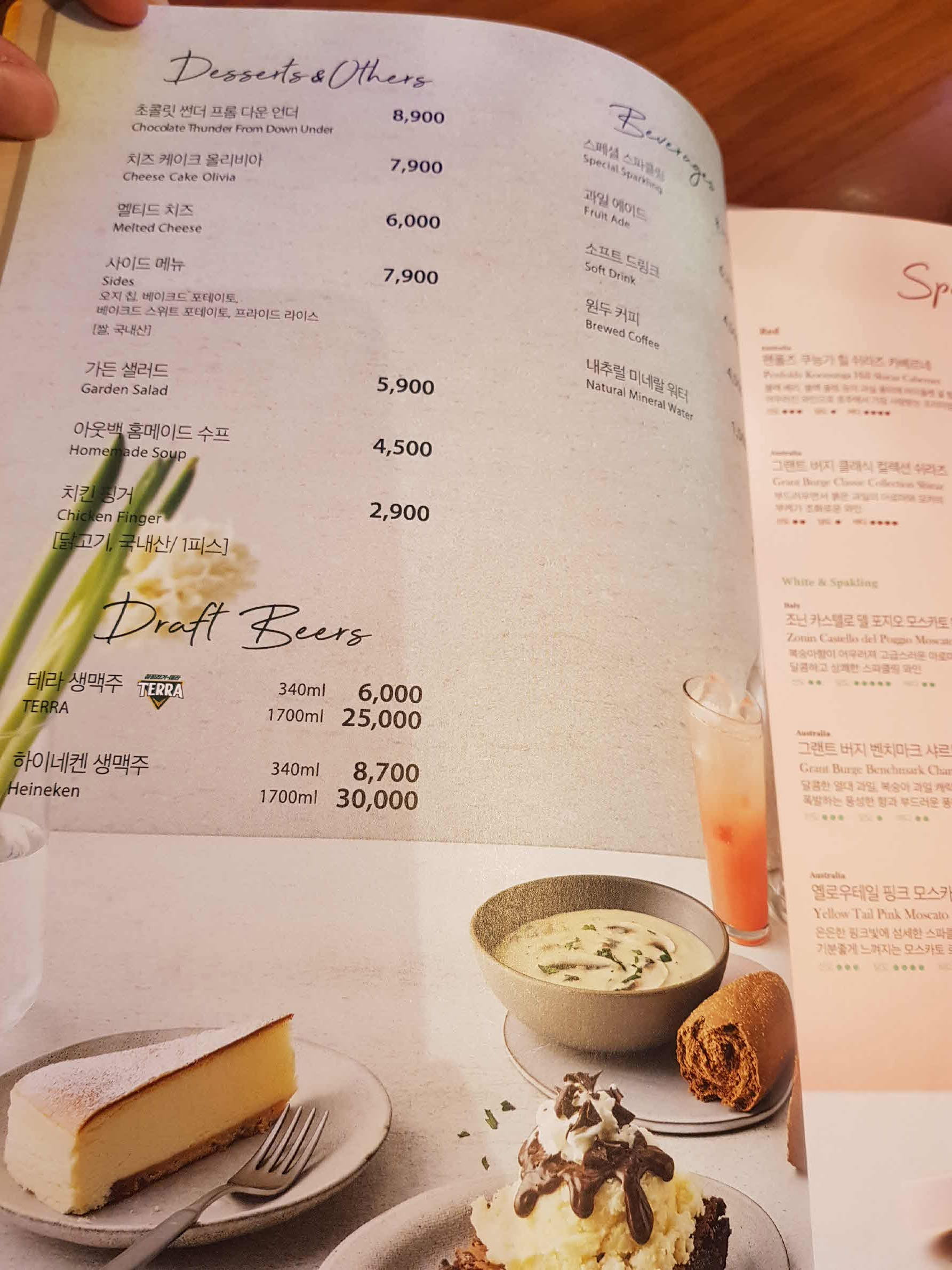 포터하우스 스테이크: 100g 당 3만원. 2명이 먹으려면 뼈 무게가 있기 때문에 700g 이상은 주문을 해야 한다. 스테이크 주문 시에는 파스타 1개와 음료 1잔, 수프 2개가 포함되어 있어 스테이크 외에 다른 걸 추가로 주문하지 않아도 되니 참고하자.