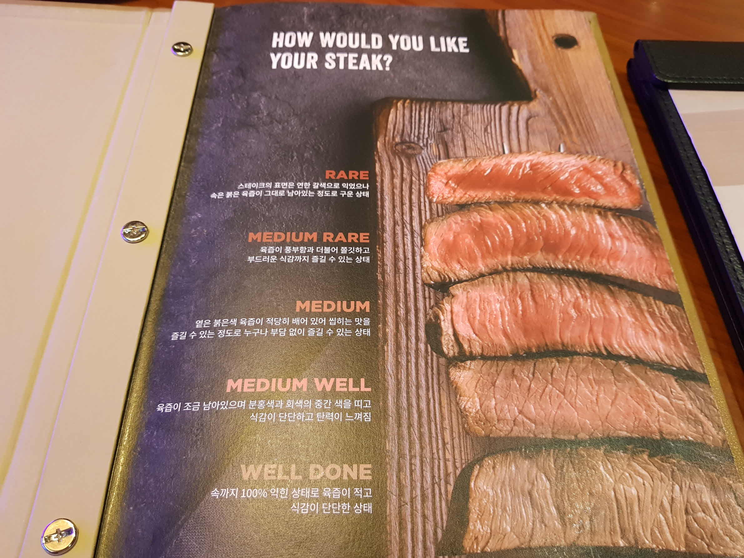 스테이크 굽기 정도는 이렇게 알아보기 좋게 사진과 함께 설명되어있으니 참고하자.
