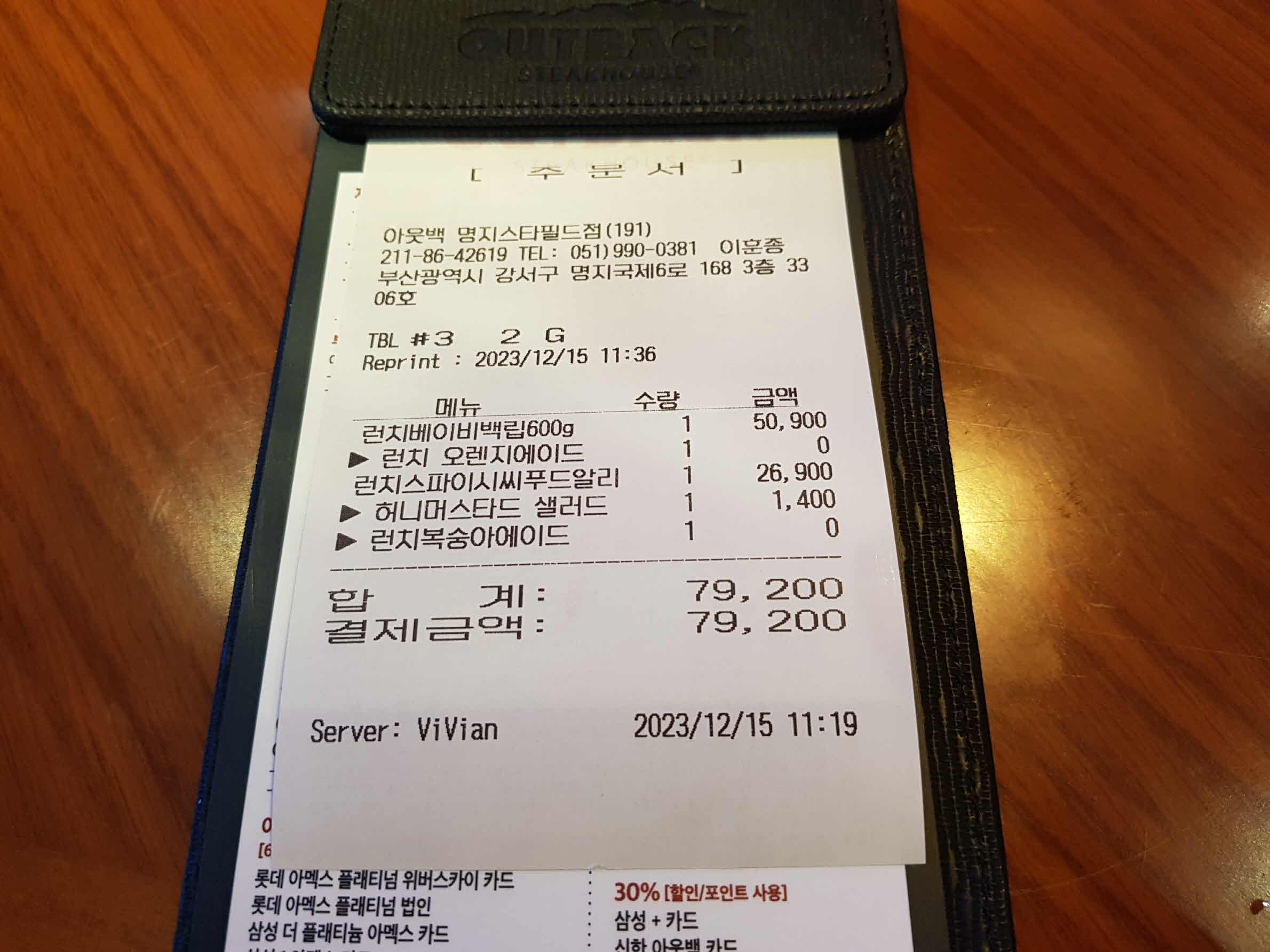 음식을 먹고 있으면 계산서를 자리에 가져다 준다. 아웃백 음식값은 다른 식당보다는 비싼 편이라 주로 제휴나 멤버십 할인을 많이 적용한다.