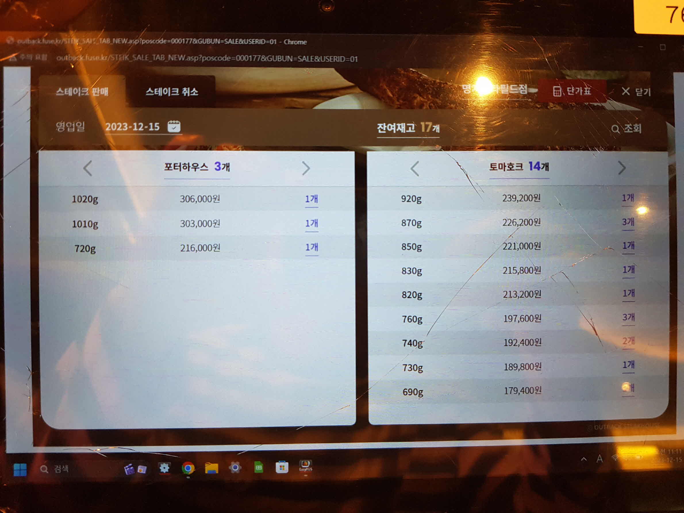 포터하우스와 토마호크는 재고가 한정 되어있어서 재고가 있어야 주문이 가능하다. 직원분이 남은 재고와 무게별 요금이 나와 있는 화면을 보여준다.