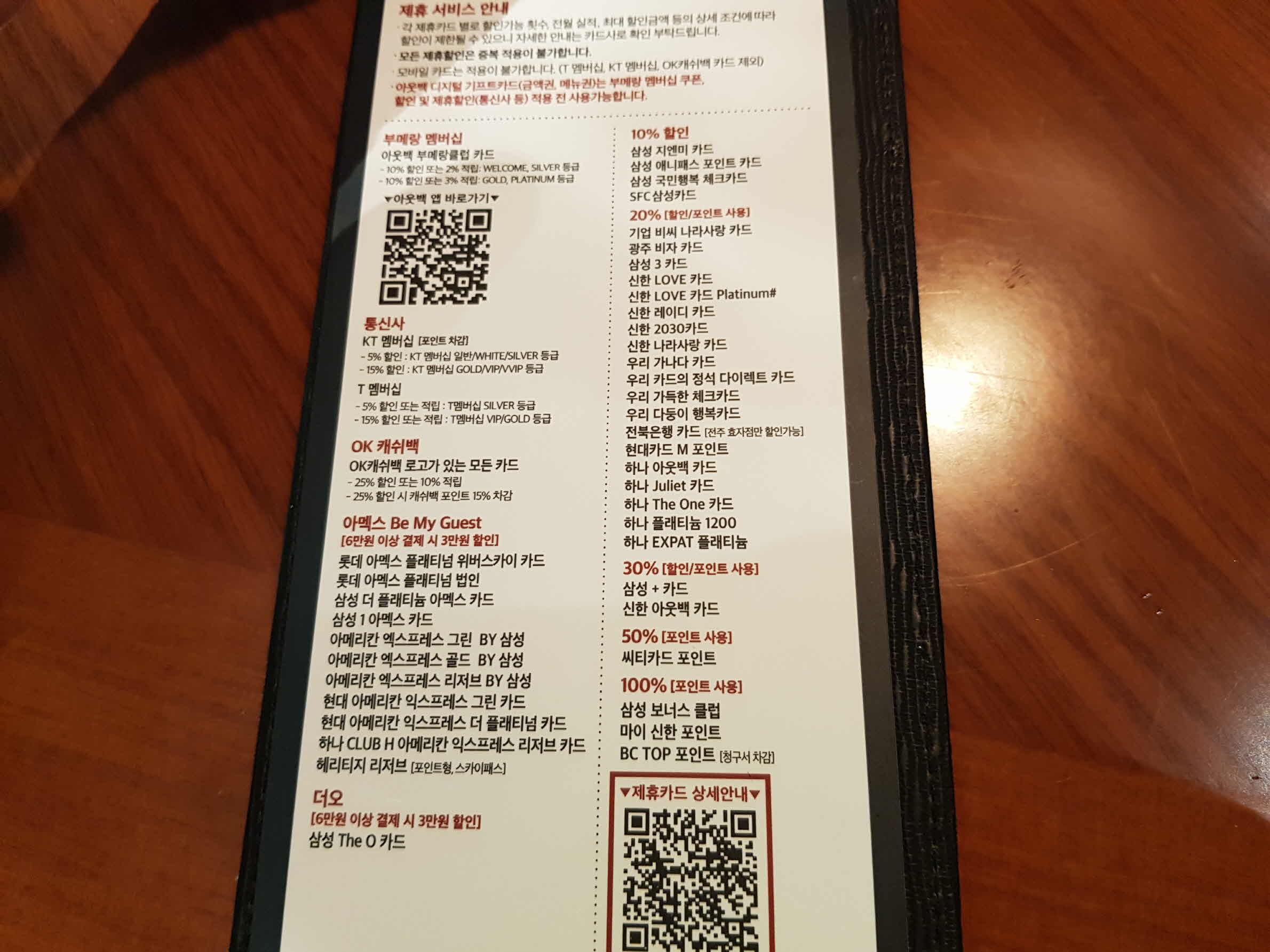 계산서를 올려보면 뒤에 제휴할인 카드 및 멤버십 할인이 나와있다.