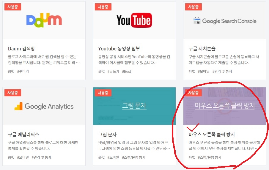 플러그인 중에서 마우스 오른쪽 클릭을 통한 복사행위를 못 하도록 해 글과 이미지의 무단 복사를 제한하는 것도 있었다.