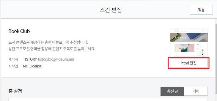 HTML 편집 들어가는 순서: 티스토리 관리 -> 스킨편집 -> HTML 편집