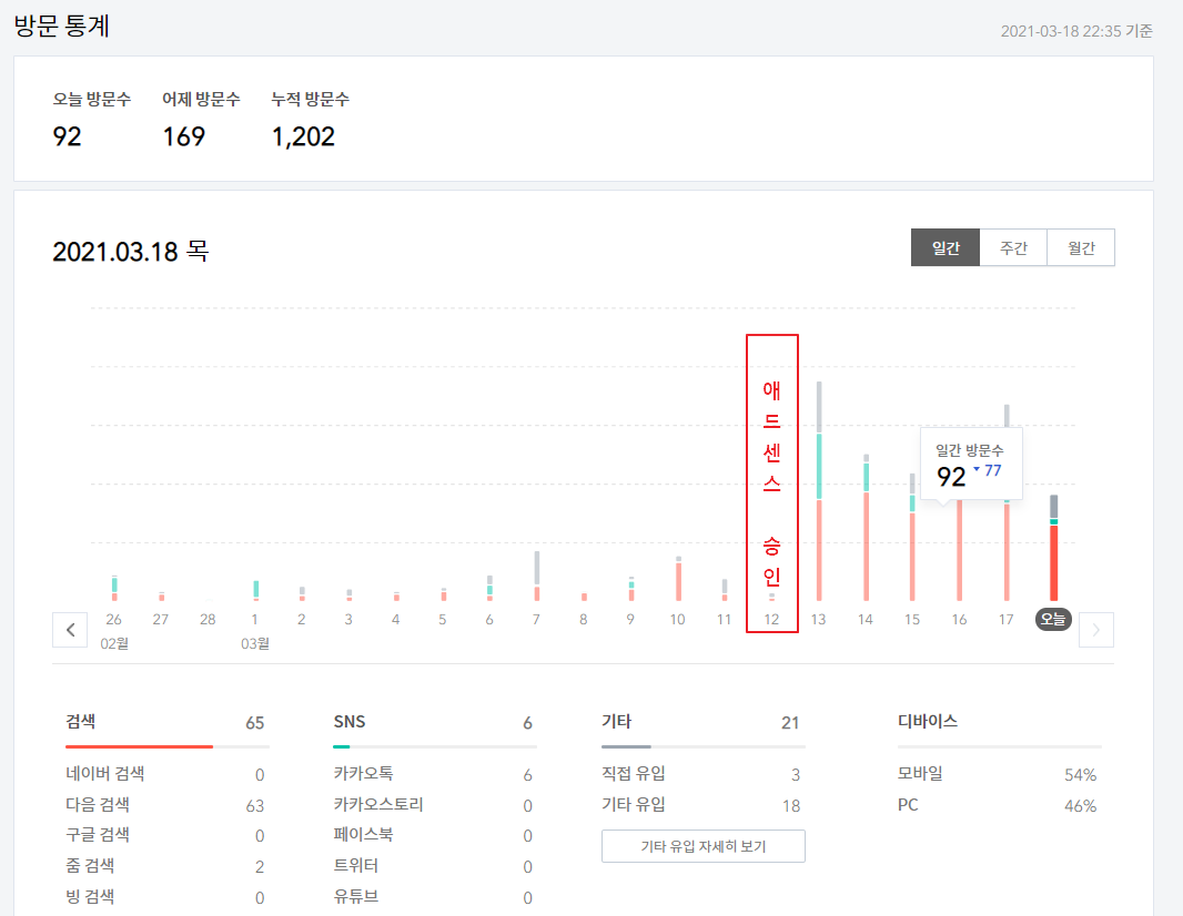 구글 애드센스를 3월 5일에 신청하고 7일 뒤인 3월 12일에 승인을 받았다. 일 평균 방문수 20명이 채 안되었는데 승인을 받고 다음날 부터 방문수가 5배정도 뛰었다. 그래봤자 100명 안팍이다.