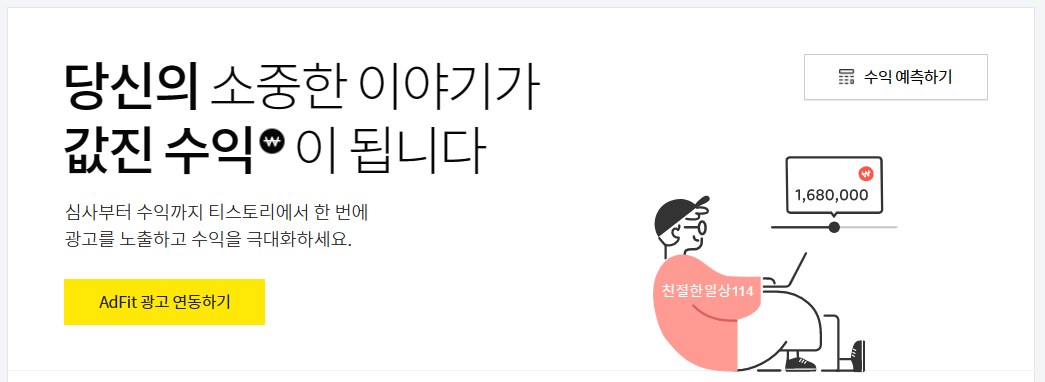 당신의 소중한 이야기가 값진 수익이 됩니다.” Kakao AdFit 이 내 걸고 있는 유혹적인 슬로건이다. 나의 일상적인 이야기를 과연 남들이 들어와서 볼까? 그리고 그 평범한 이야기들이 수익으로 이어질까? 의문이 들었다. 네이버에는 1600백만개의 블로그 계정이 있다고 하는데 정작 주변에는 블로그를 운영하고 있는 사람이 안보인다. 이러다 보니 블로그가 돈이 된다는 이야기는 특수한 경우, 그리고 소위 말하는 파워 블로거나 특정한 몇몇에게만 해당하는가 보다 여겨졌었다. 이런 생각을 뒤엎고 블로그를 시작하게 된 건 가까운 지인의 티스토리 블로그에 대한 이야기를 듣고 나서였다. 이 지인은 블로그를 운영한지 10년이 넘었는데 꾸준히 블로그를 운영하다보니 왠만한 직장인 월급 만큼 수익이 나올 때도 있다고 했다. 10년이라는 강산이 변하는 세월동안 들인 공과 시간이 엄청나니 당장 그런 수익을 기대하는건 가당치 않겠다. 하지만 나쁜 일을 하는 것도 아니고 오히려 반대로 일상속에서 얻는 정보를 공유하는 일로 돈도 벌 수 있다는데 한번 시작해보자 싶었다.