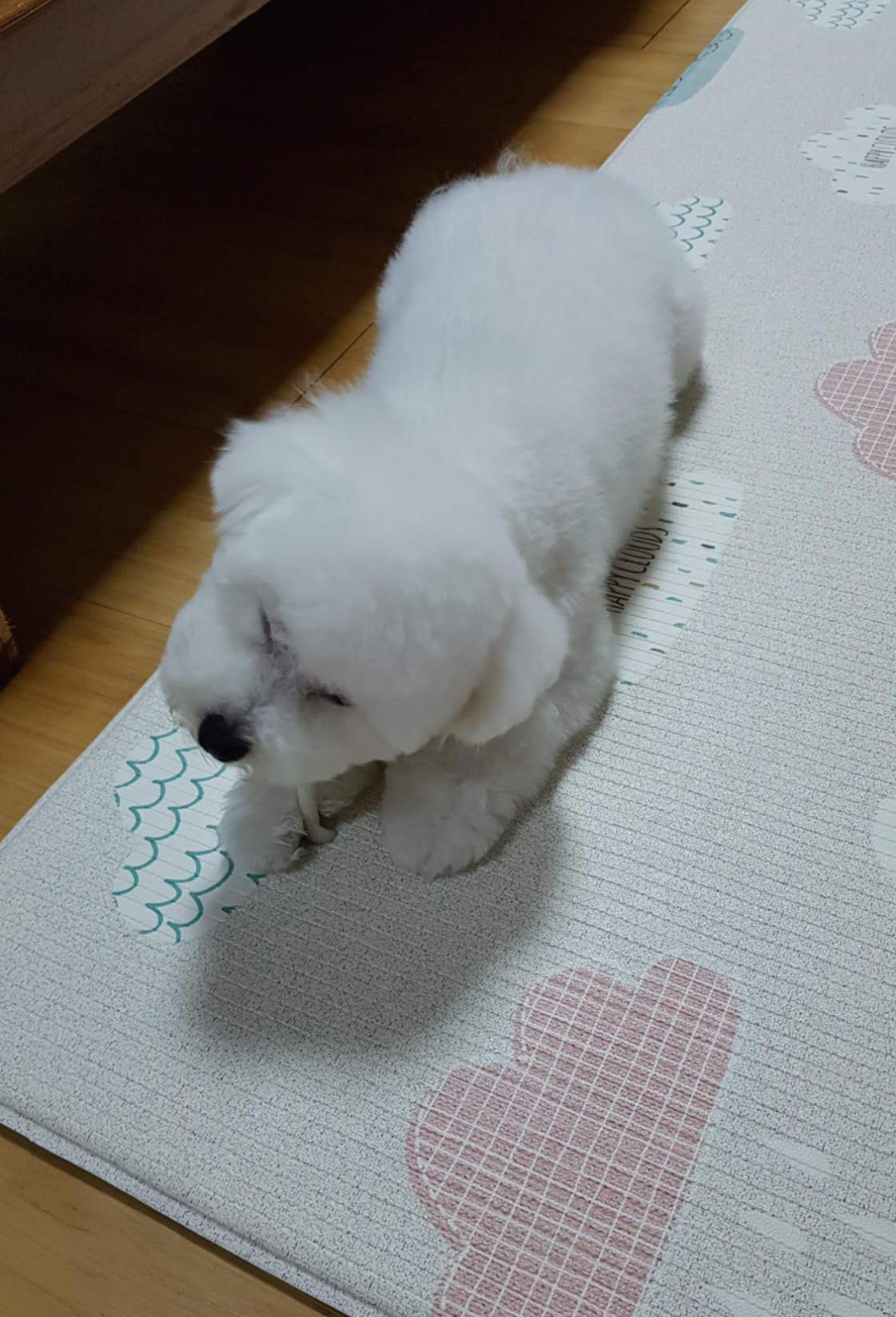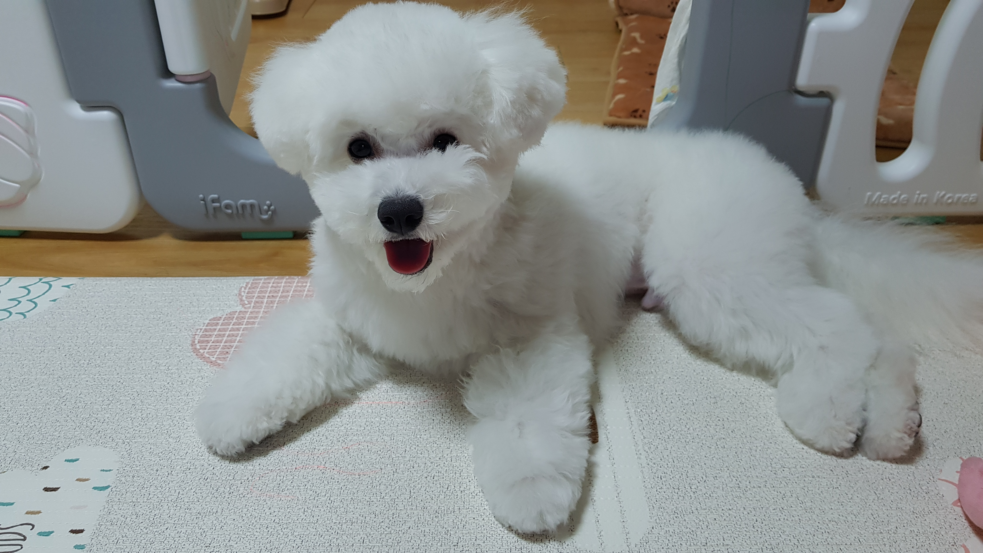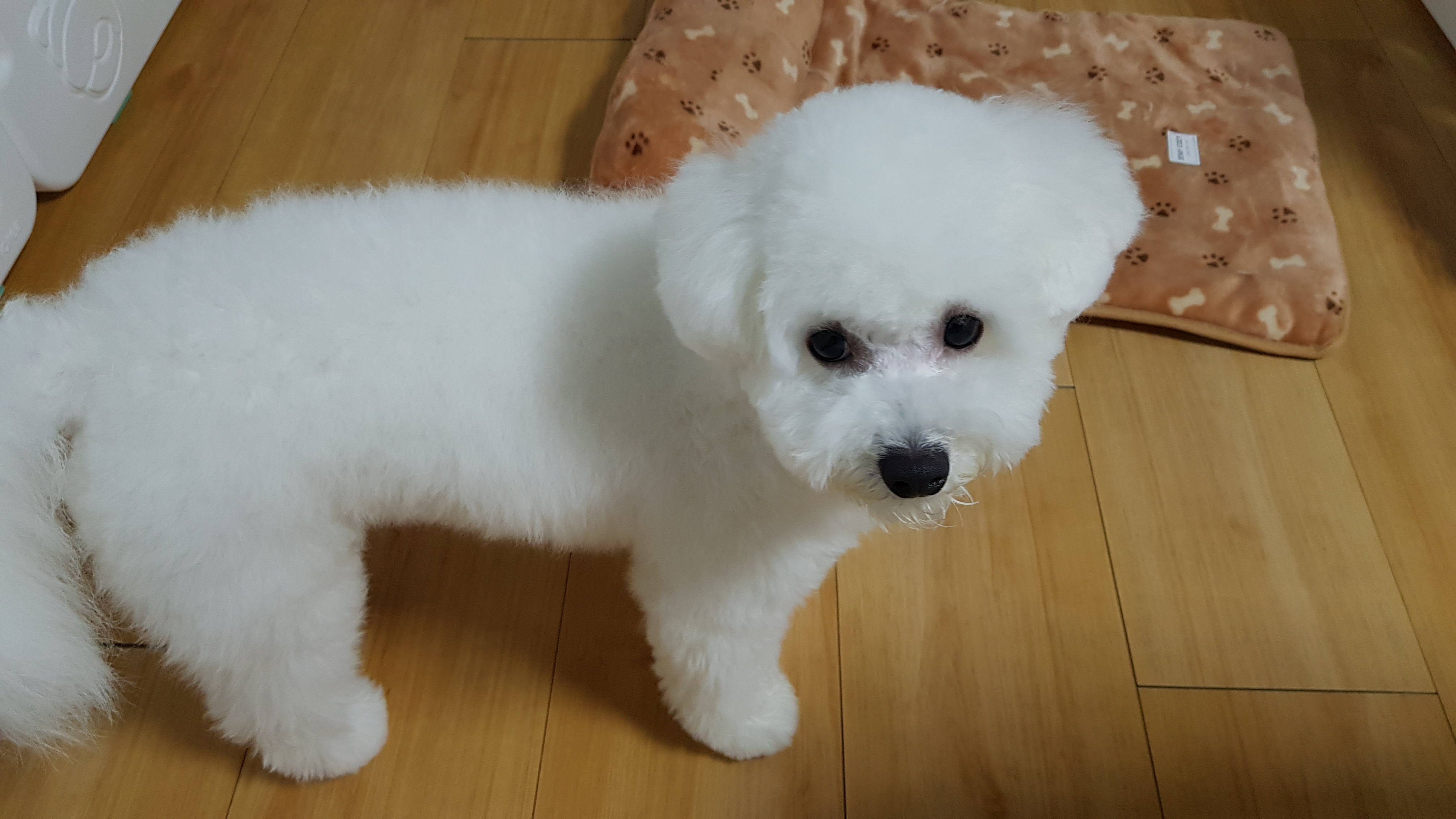첫번째 베넷미용보다는 충격이 덜했지만 그래도 미용전의 귀여움까지 깍여나간건 여전하다. 전체적으로 뽀송해진 느낌과 발에 벙어리장갑을 낀것 같은 모양이 깍여나간 귀여움을 커버해준다.