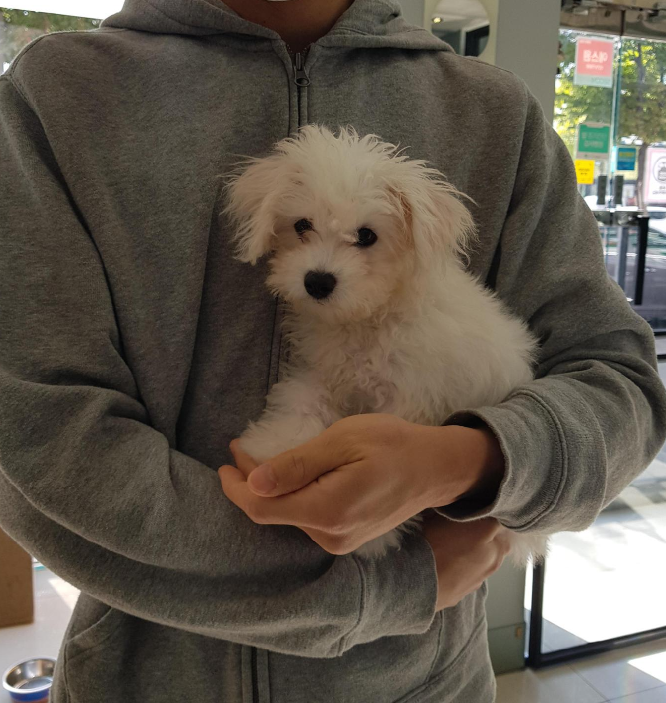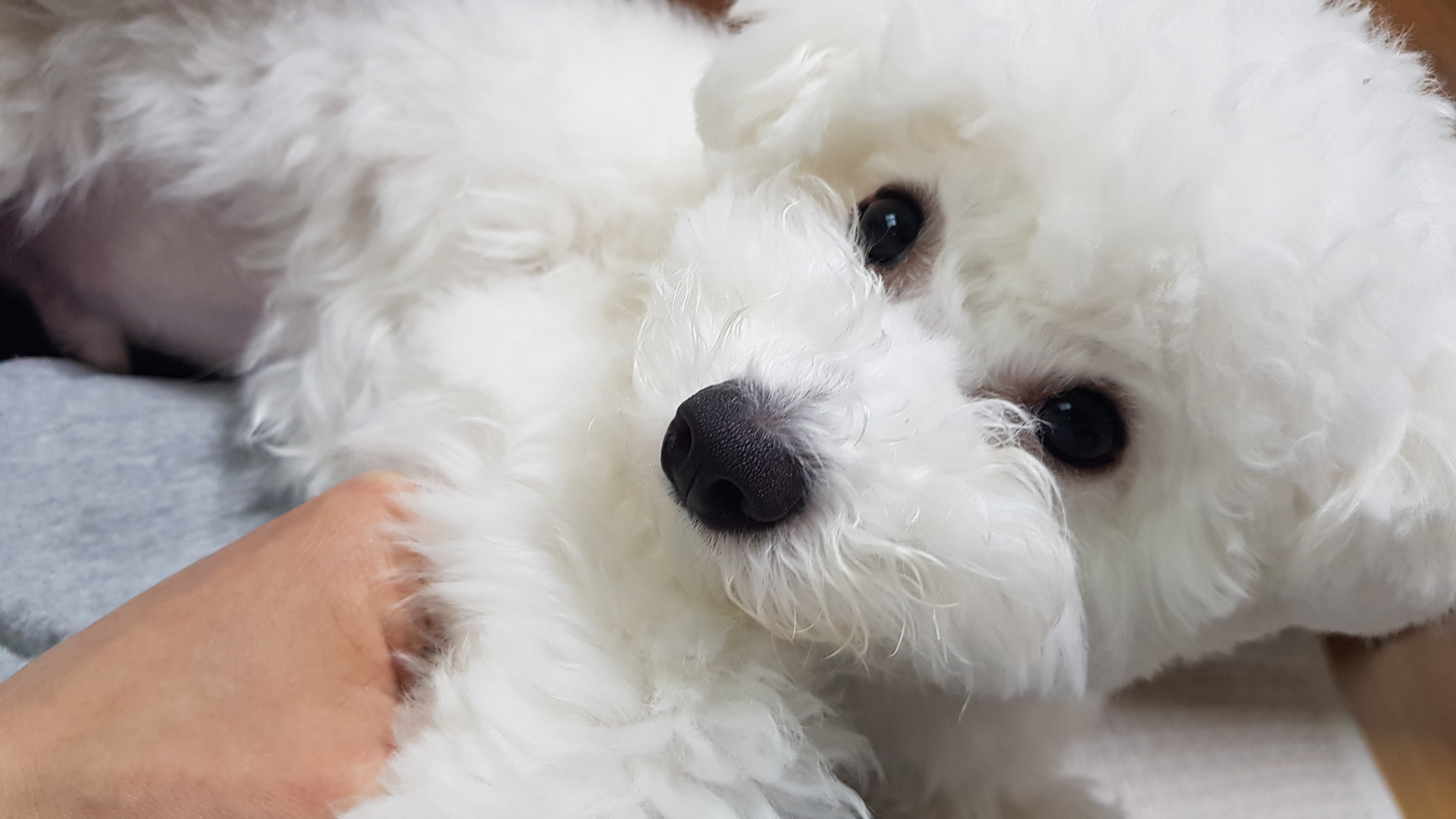 첫 미용을 하기전에는 베넷털이라서 털이 가늘고 곱슬거림이 적다. 베넷털을 밀어줘야 털에 힘이 생기고 잘 자란다고 하여 미용을 감행하게 되었다. 위 사진들은 그나마 초롱초롱할때 찍은 사진들이라 상태가 양호한데 자다가 일어났을때는 털이 눌려 노숙견 같아 보이기도 했다. 저때를 사진으로 보자니 언제 저랬나 싶게 아련하고 나름 부스스한 매력이 있다.