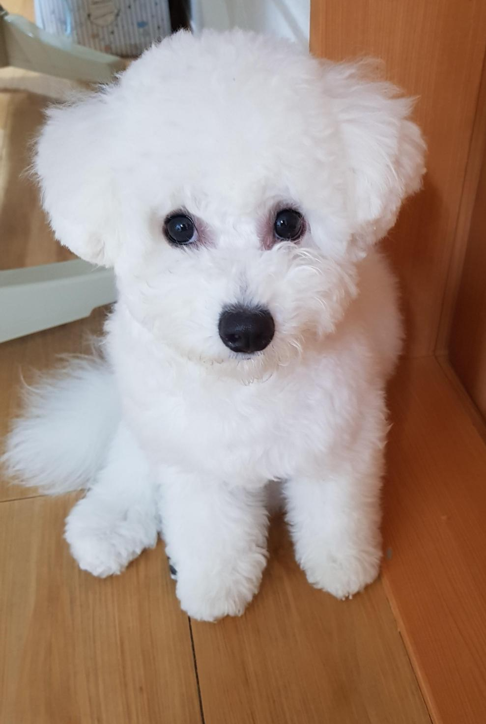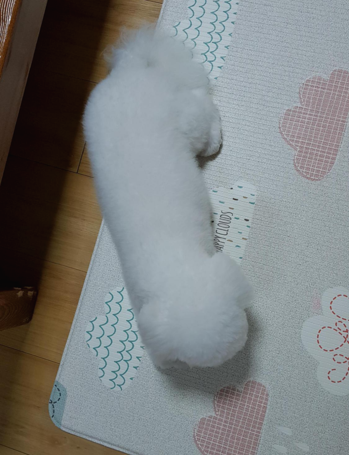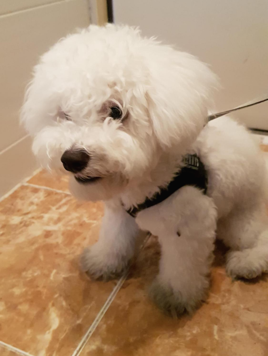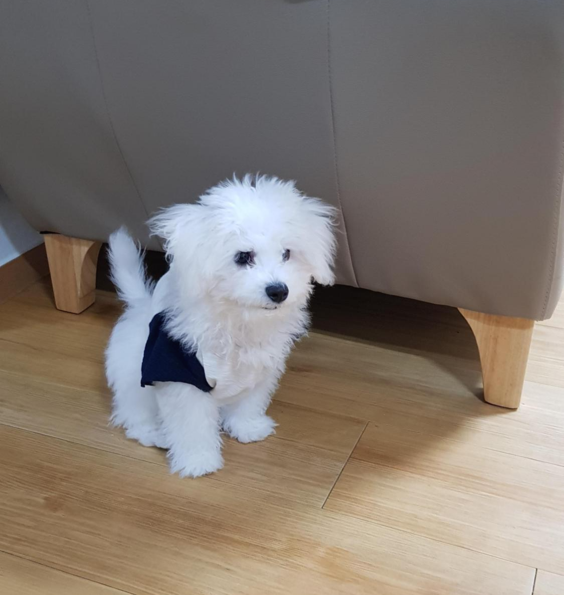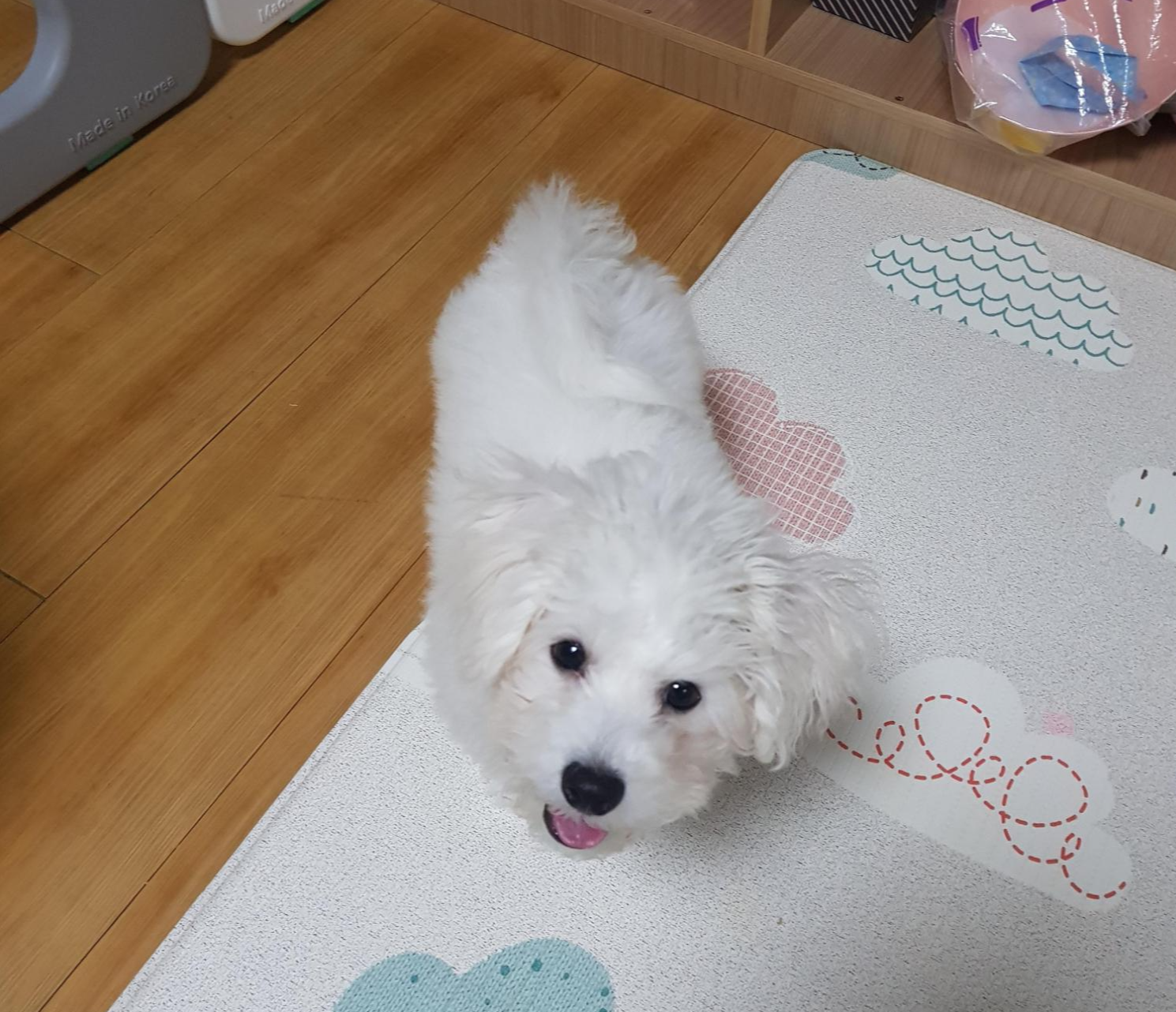 첫 미용을 하기전에는 베넷털이라서 털이 가늘고 곱슬거림이 적다. 베넷털을 밀어줘야 털에 힘이 생기고 잘 자란다고 하여 미용을 감행하게 되었다. 위 사진들은 그나마 초롱초롱할때 찍은 사진들이라 상태가 양호한데 자다가 일어났을때는 털이 눌려 노숙견 같아 보이기도 했다. 저때를 사진으로 보자니 언제 저랬나 싶게 아련하고 나름 부스스한 매력이 있다.
