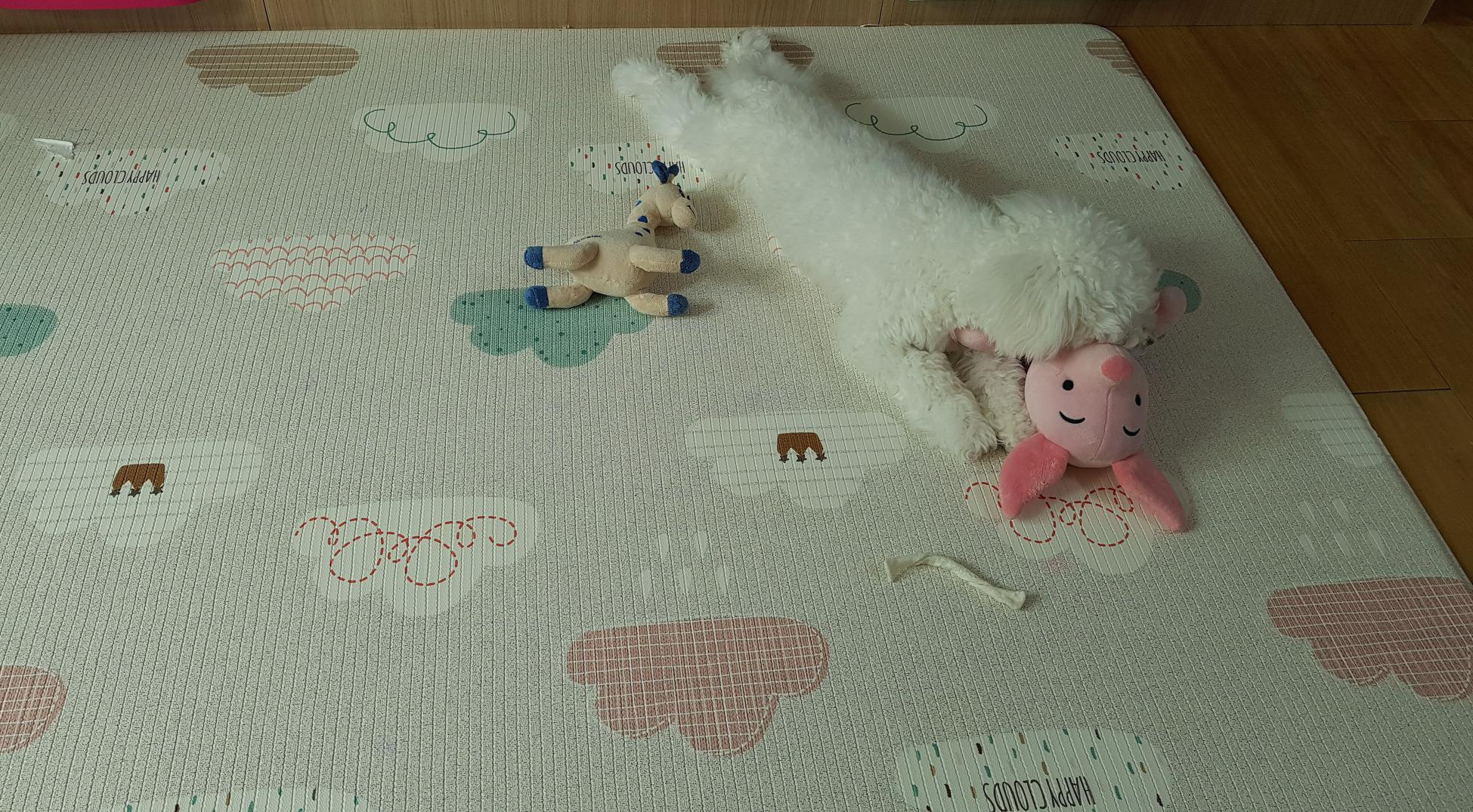 어렸을때는 배를 내놓고 드러누워서 잘때가 많았었는데 조금 크니 이렇게 네발 쭉펴고 옆드려 잘때가 많다. 애착인형을 베고 네발 펴고 자고있는거 보니 세상 편해보인다. 저러다 일어나면 옆에 있는 개껌을 물고 와서는 개껌을 잡아달라고 한다. 개껌을 혼자 물고 씹는거 보다 잡아주는걸 좋아한다.